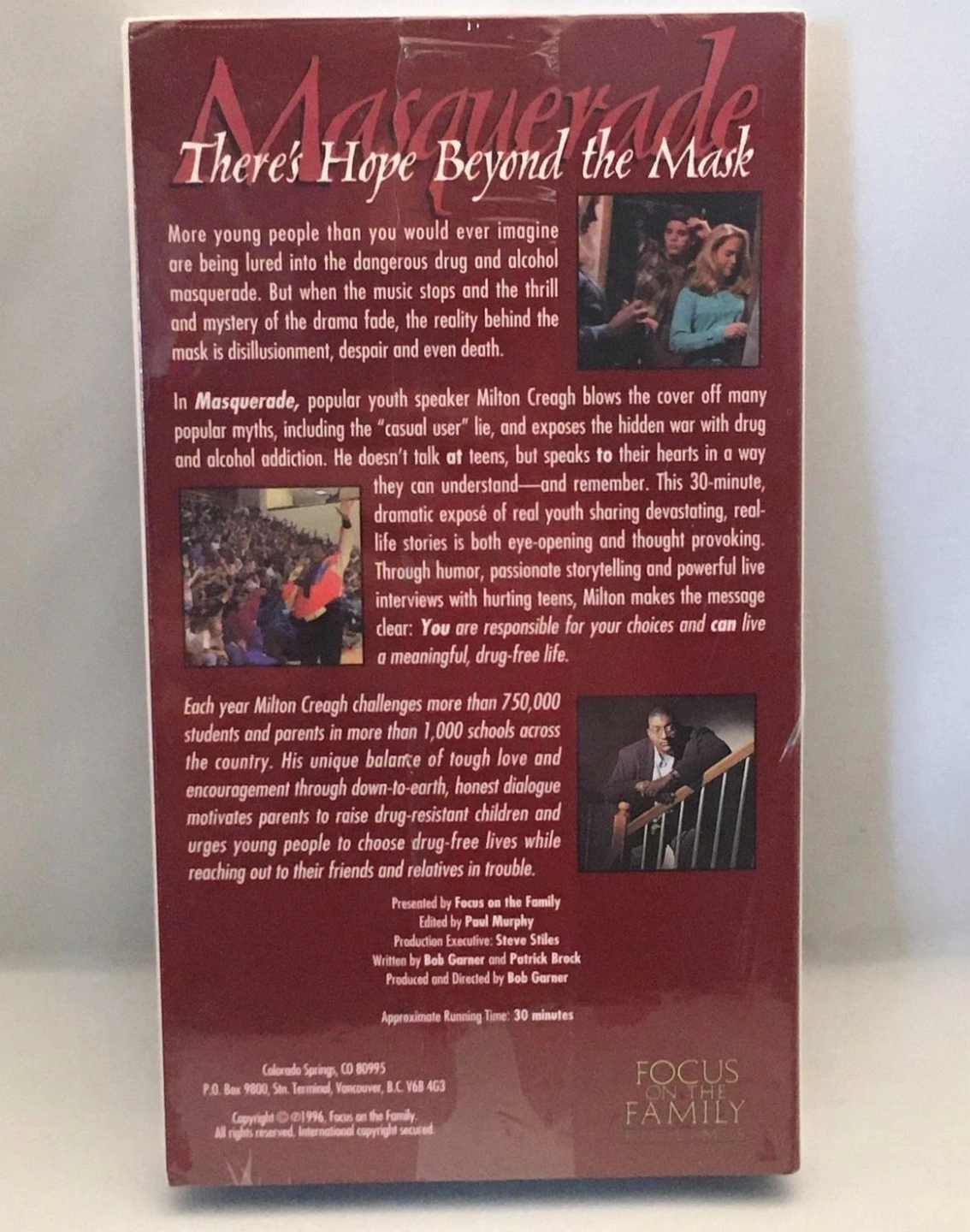 15This is a BRAND NEW, SEALED VHS tape of Masquerade from Focus on the Family. Tape has been in storage and not exposed to outside elements. Great for those who love retro media, old movies, Star 99.1 and/or Focus on the Family. Please ask questions before buying, no returns. Genre: Drama Rating: PG Title: Masquerade