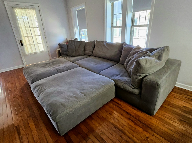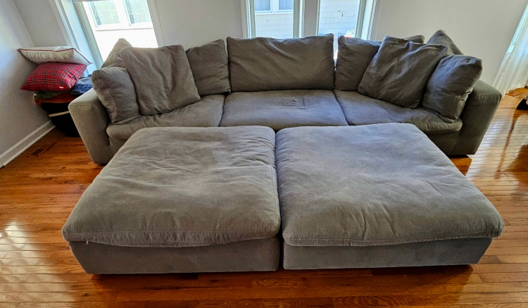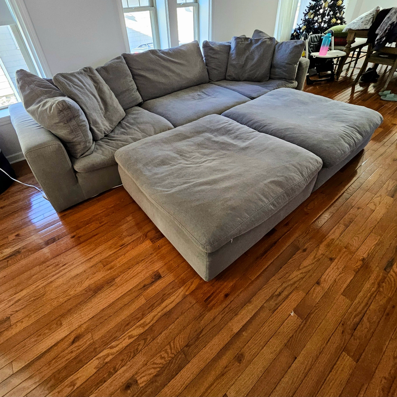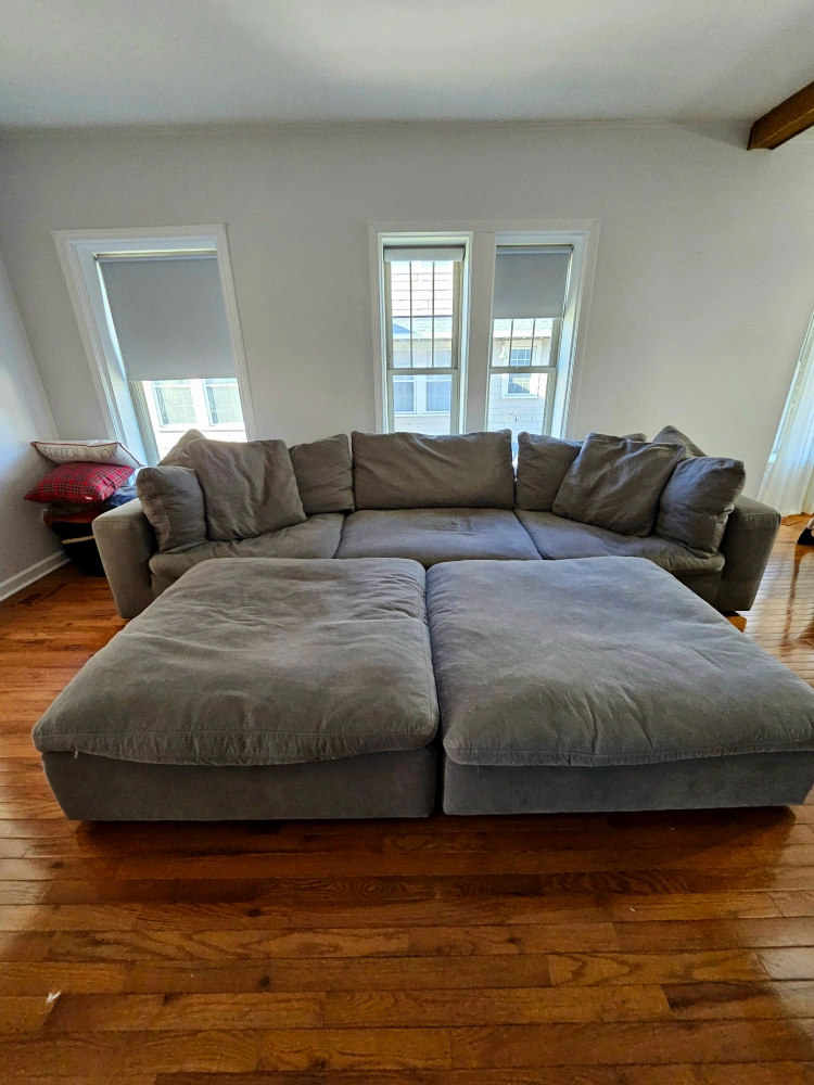 Large gray modular sectional sofa. Five pieces. Includes two large ottomans. Great for large living rooms. Good condition. Covers can be unzipped and put into washer for easy cleaning. Dimensions are listed in the pictures above. will need a truck for pick up due to the size of the couches.