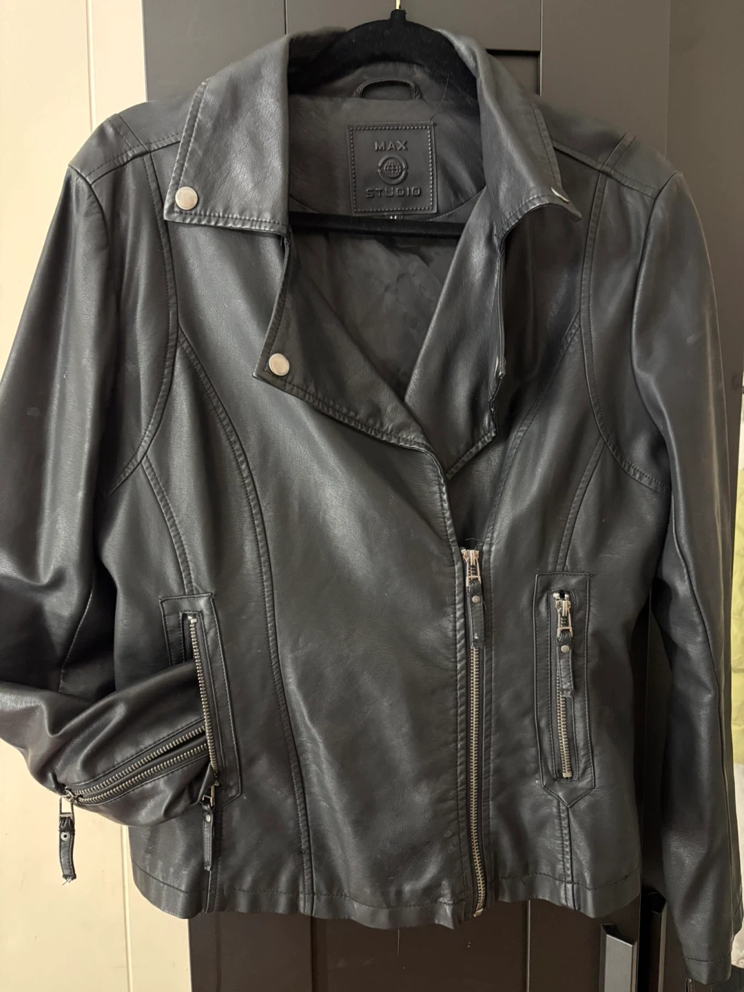 18Check out this stylish black leather jacket from Max Studio! It's a great addition to any wardrobe, perfect for adding a bit of edge to your look. The jacket features a classic moto style with an asymmetrical zipper closure and zippered pockets. It's in great condition and ready for a new home!