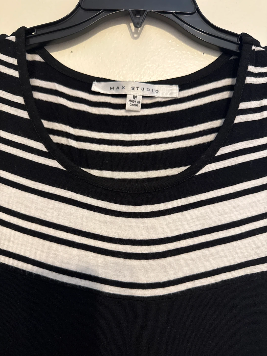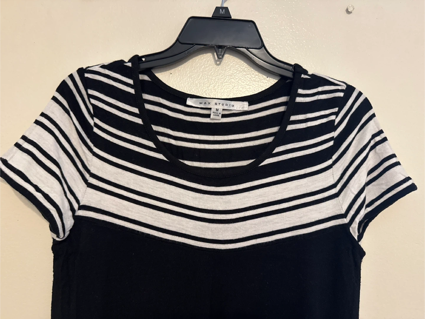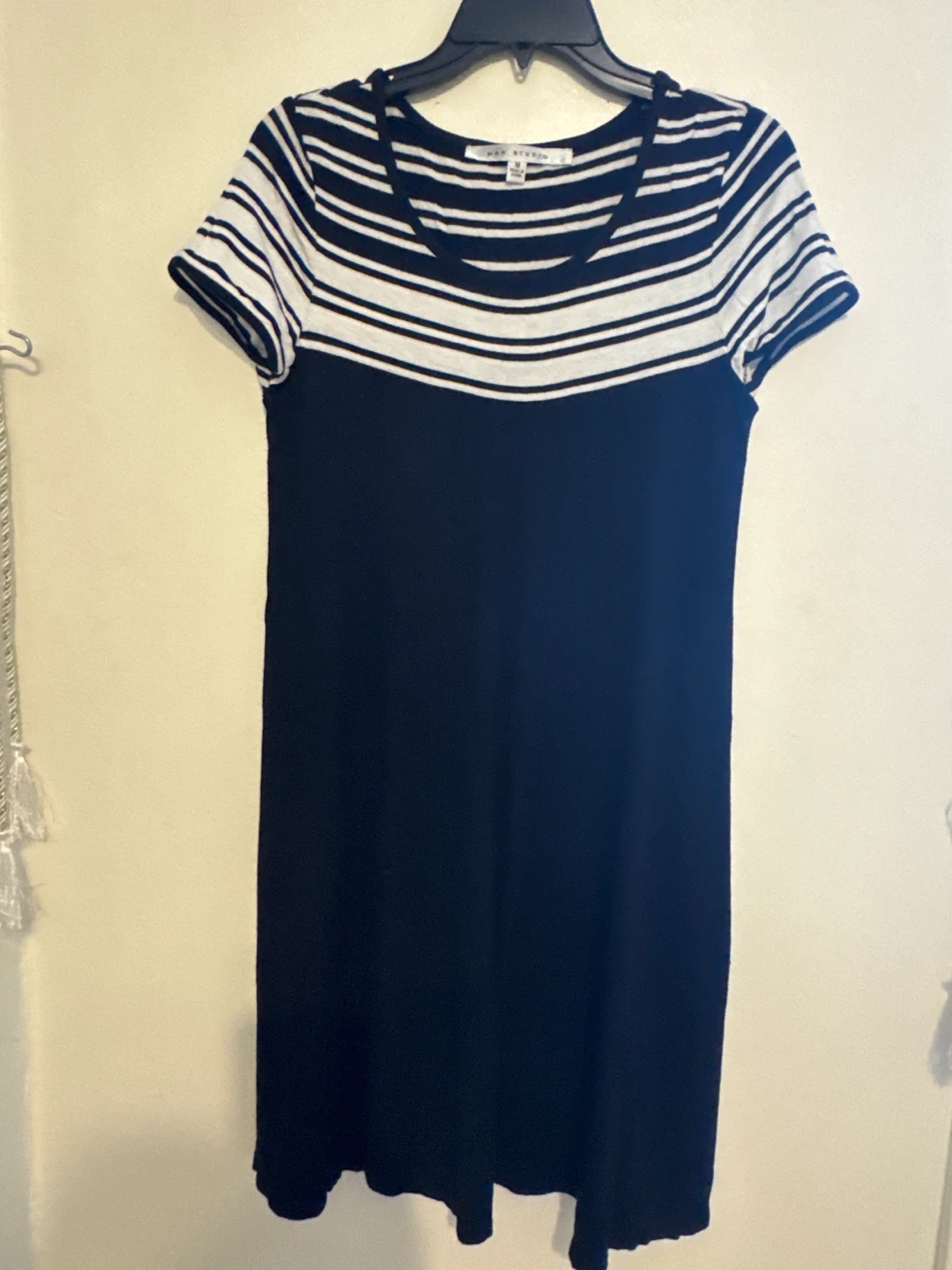 Selling a cute Max Studio dress in a black and white striped pattern! It's a size medium and in great condition. Perfect for casual outings or dressing up with accessories