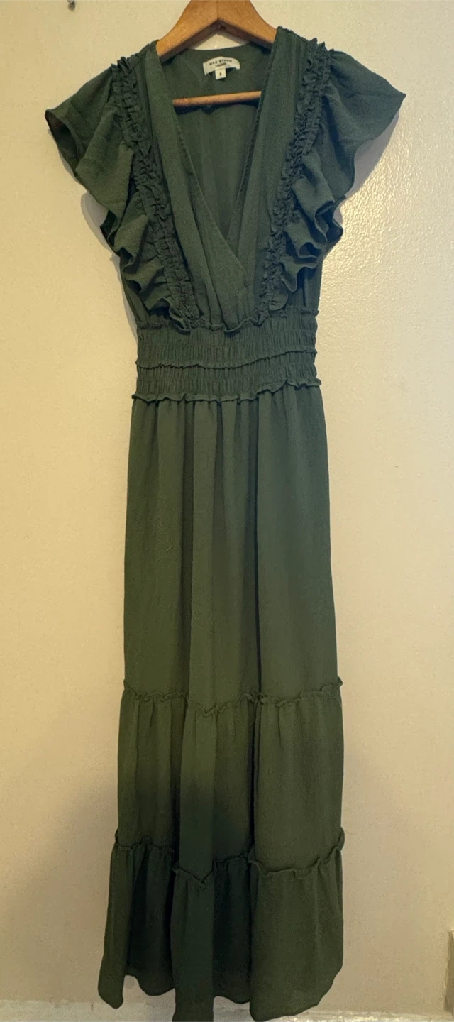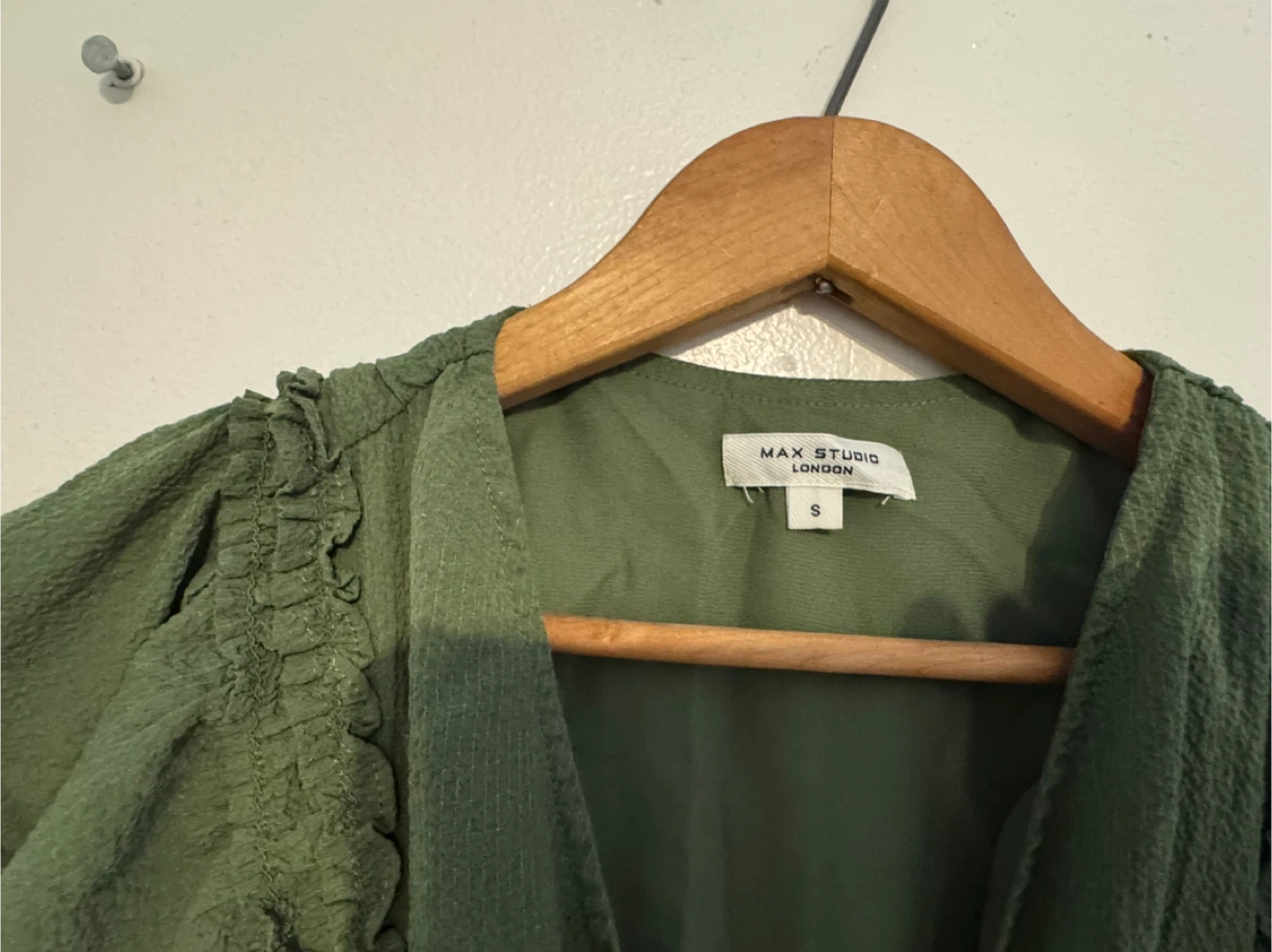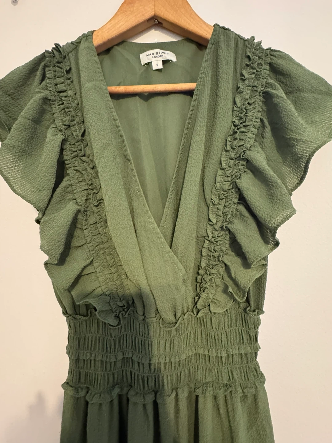 I'm selling a beautiful green dress from Max Studio London. It's a size small and features a flattering V-neck and ruffled details. Perfect for a casual day out or dressed up for an evening event!