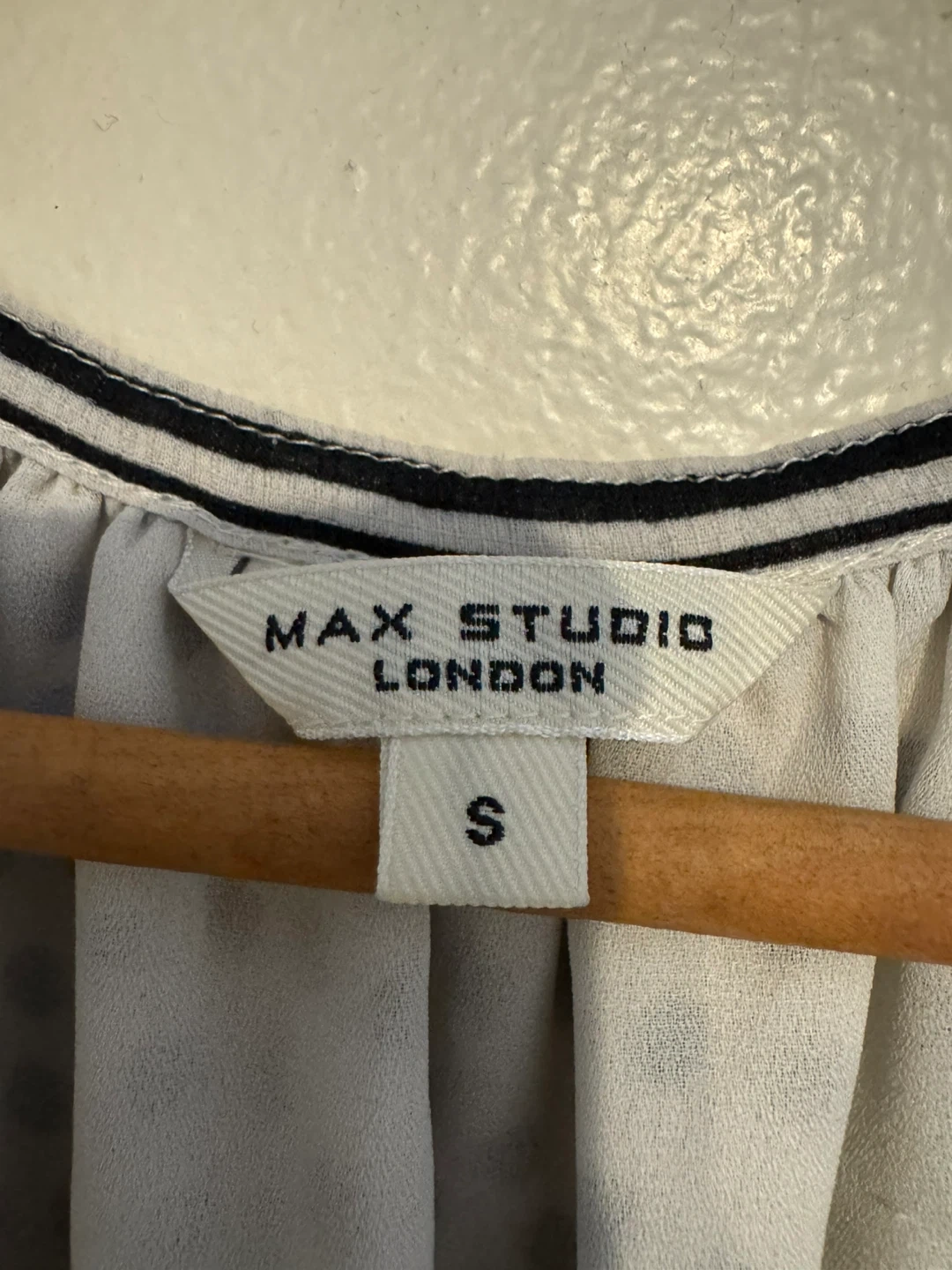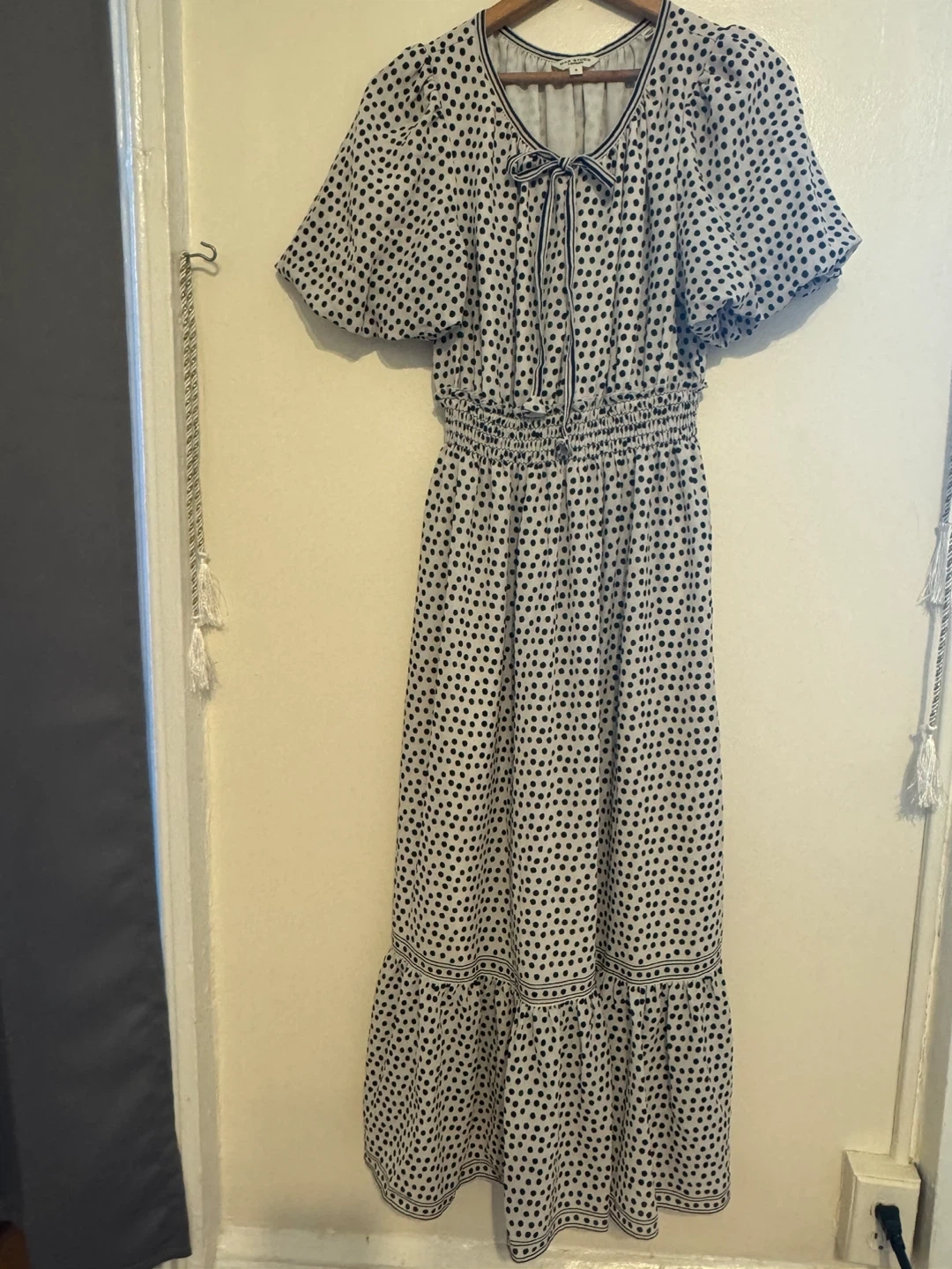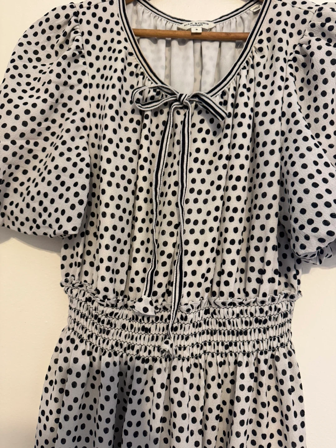Selling a cute Max Studio London dress with a fun polka dot pattern! It's a size small and features a tie at the neckline and an elastic waist. Perfect for a casual day out or dress it up for an evening event