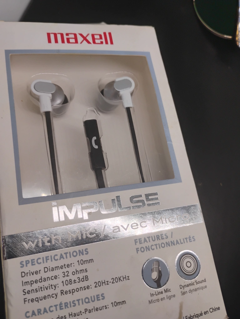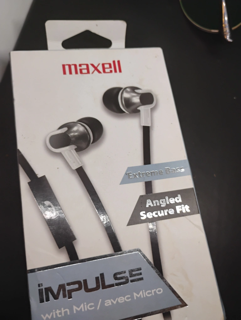New Maxell Impulse wired earbuds. Angled secure fit. Extreme bass. Includes inline microphone. Features dynamic sound.
