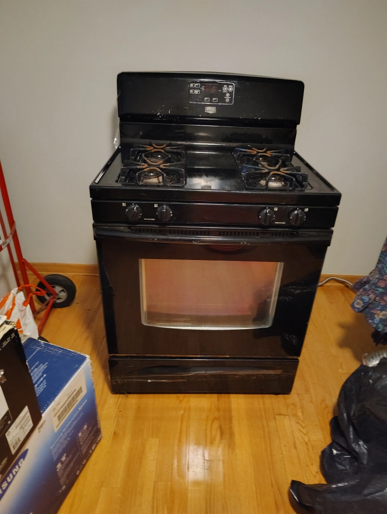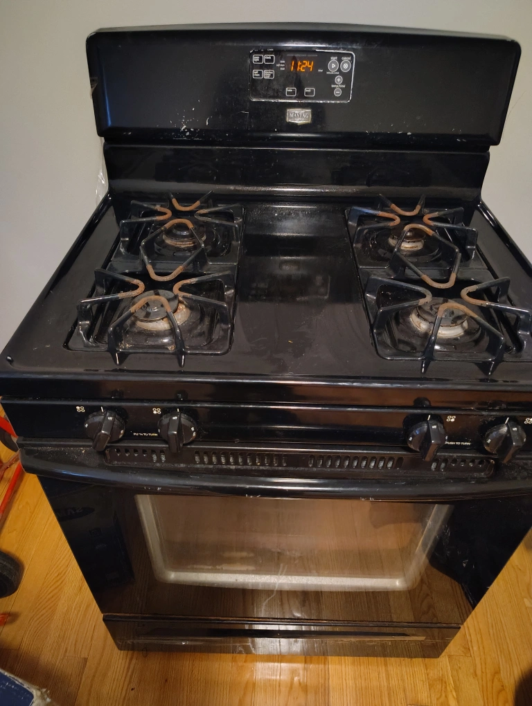 I'm selling a black gas range by Maytag. It features four burners and an oven. It's a great addition to any kitchen!