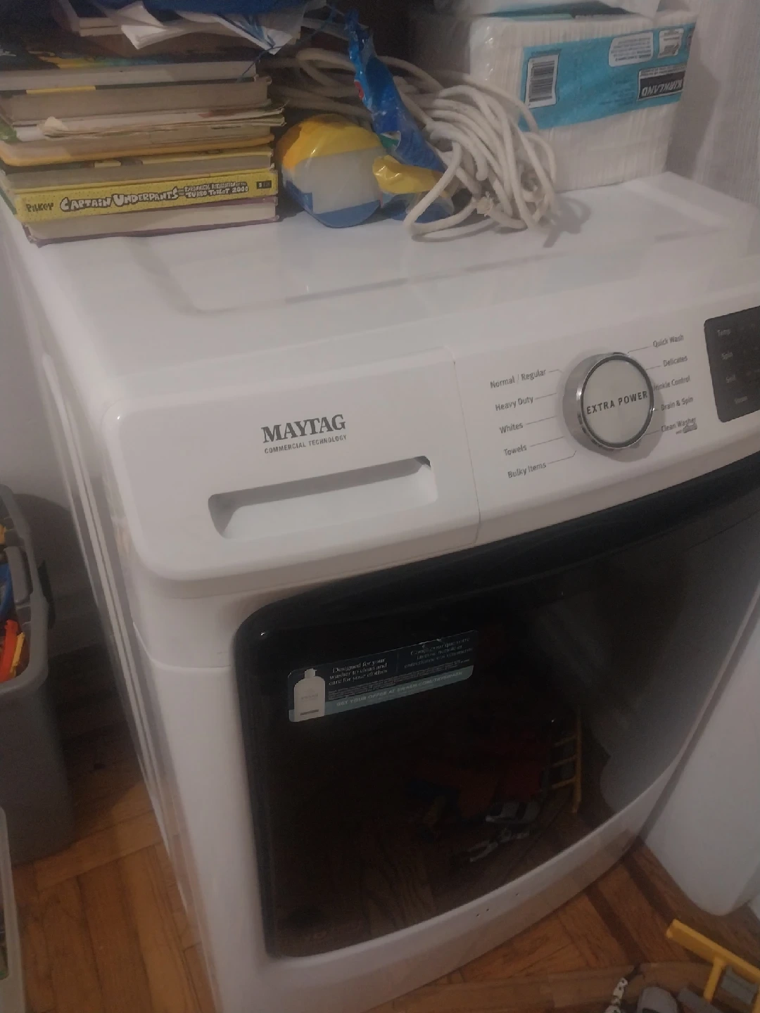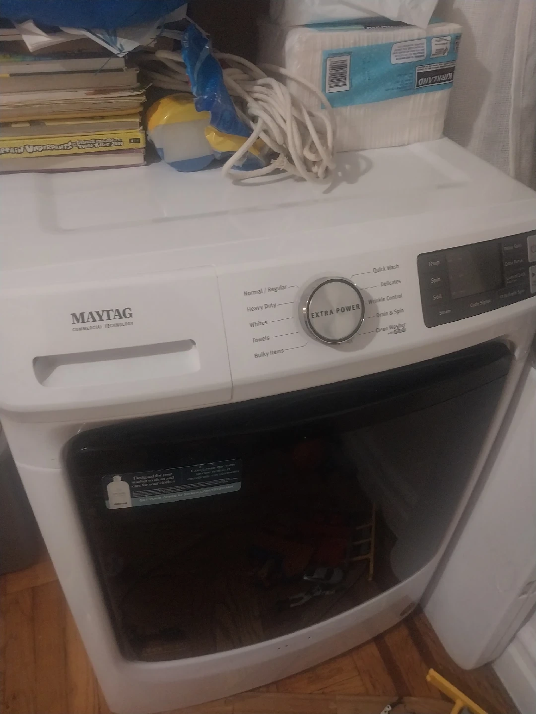 10Selling a Maytag washing machine. It has an extra power button and several wash cycles, including normal/regular, heavy duty, whites, towels, and bulky items