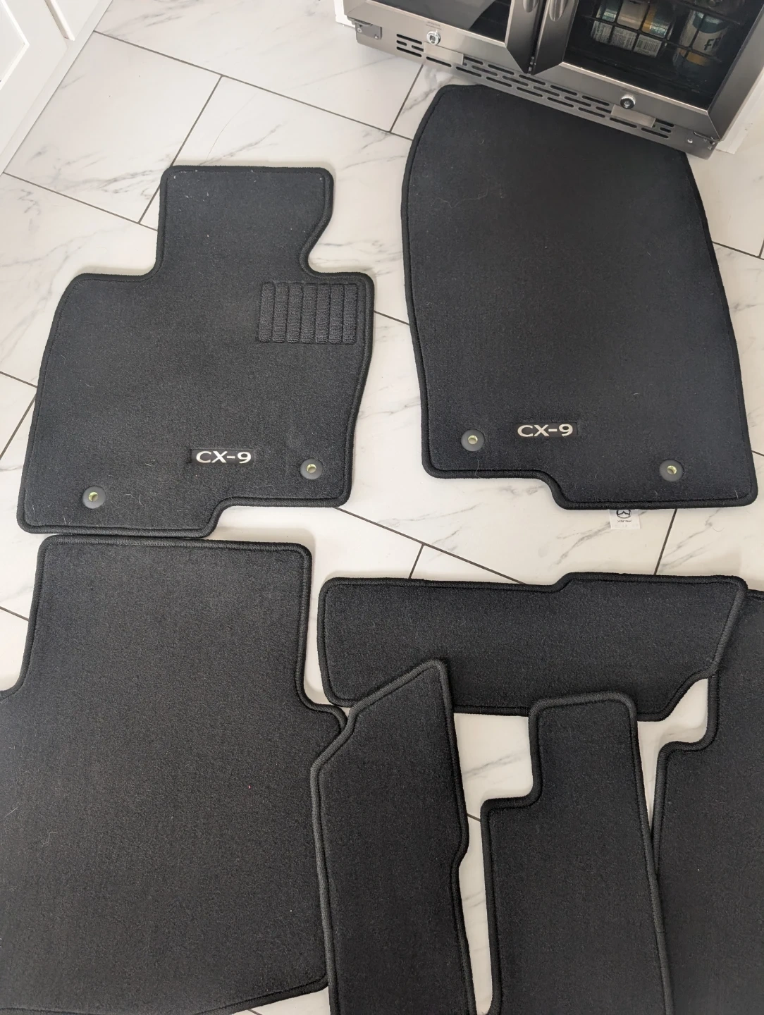 60Selling a set of black floor mats for a Mazda CX-9. They appear to be in good condition and include mats for the front, back, and middle rows. 2016-2023