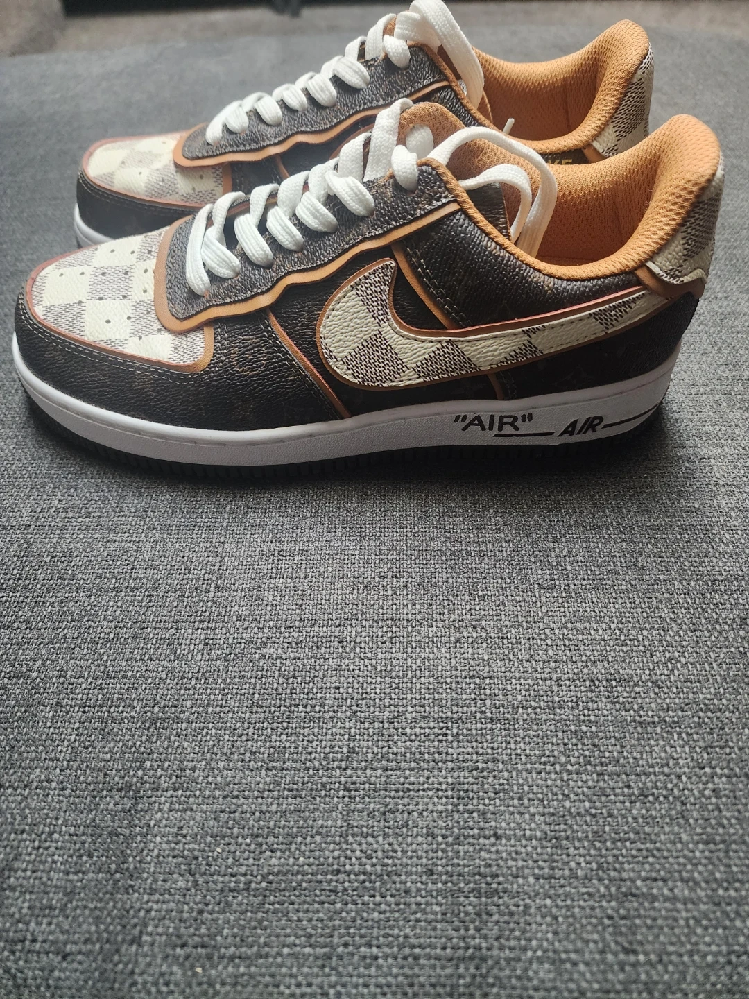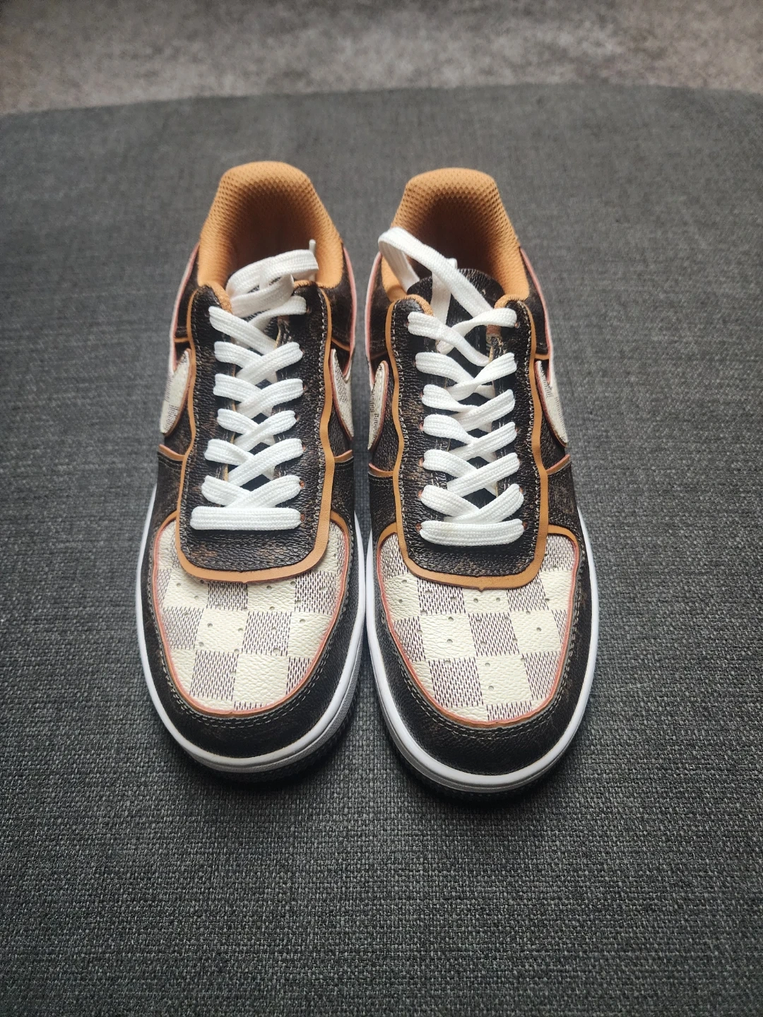 These custom sneakers feature a checkerboard pattern with brown and tan accents. They have white laces and "AIR" branding on the sole.