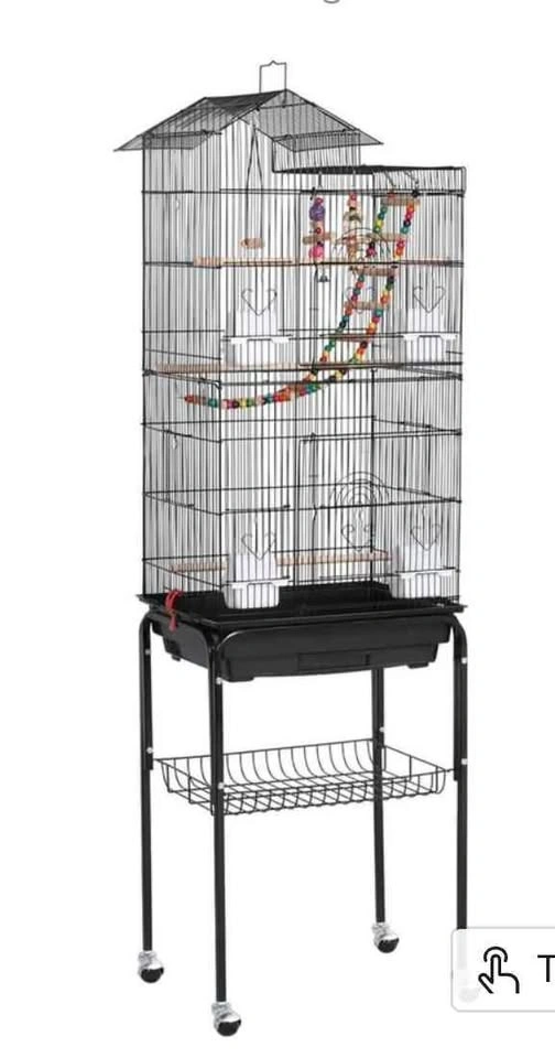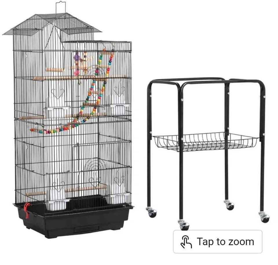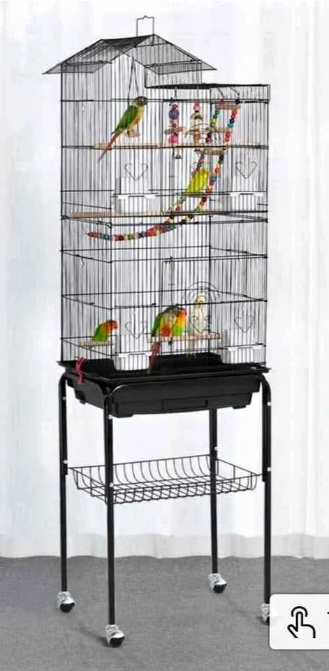 New in the box, never used! Model 591628. Painted metal cage with detachable rolling stand. Bar spacing is 1cm/0.4". Includes free perches, feeders, and toys. Suitable for medium/small size birds like budgies, cockatiels, parakeets, and lovebirds.