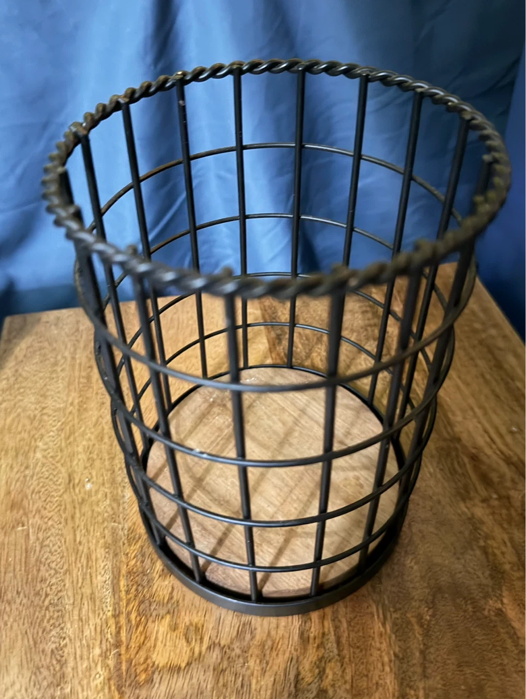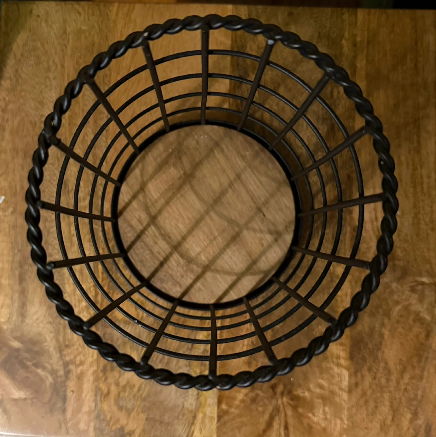 This is a sturdy wire basket with a unique twisted rope detail around the top rim. It has a simple, open cage design with a solid wooden base. It's great for holding fruit or small items on a counter or table!