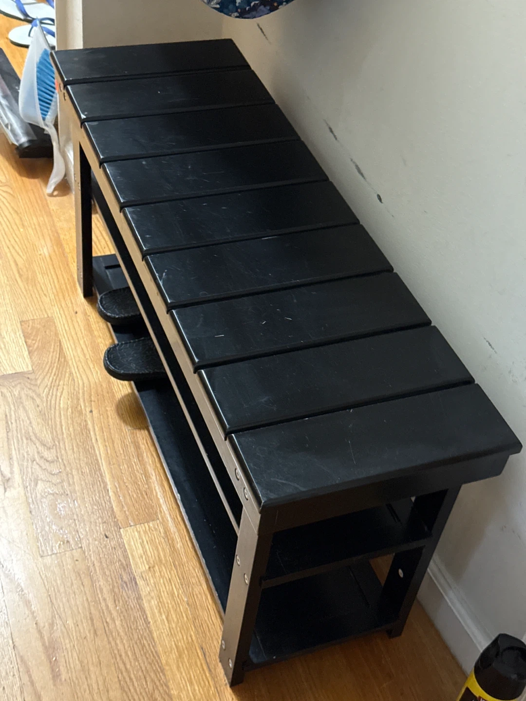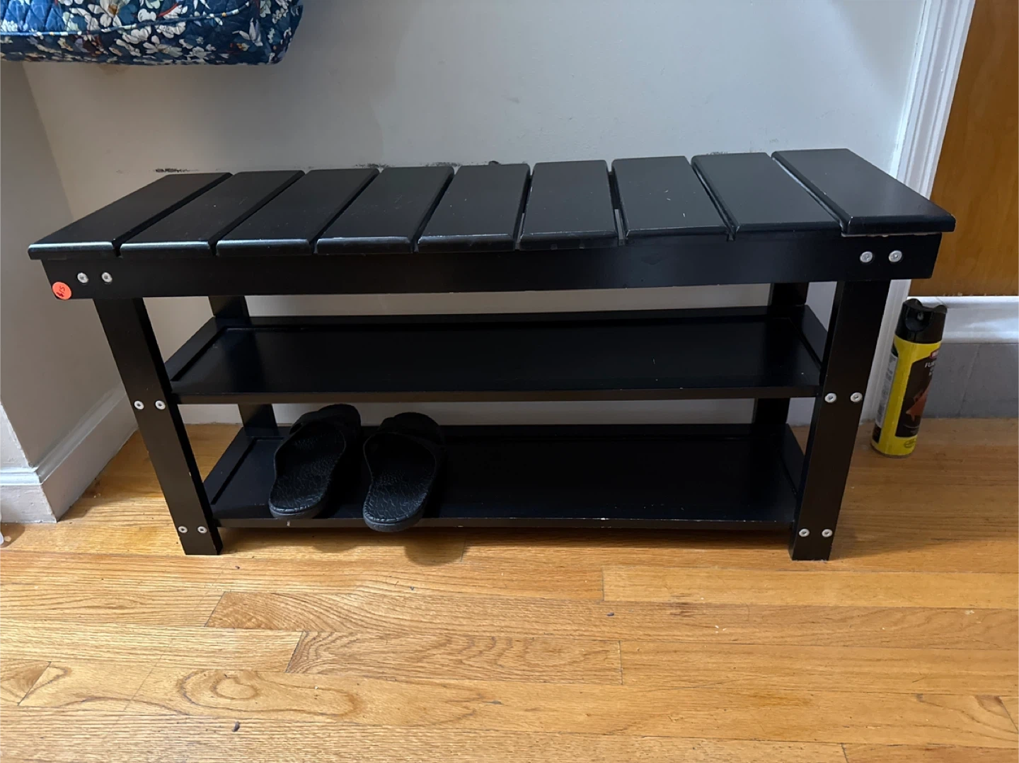Selling a sturdy black shoe bench. It has a convenient storage shelf underneath for keeping your slippers or other items organized. Great for entryways or mudrooms to keep shoes tidy!