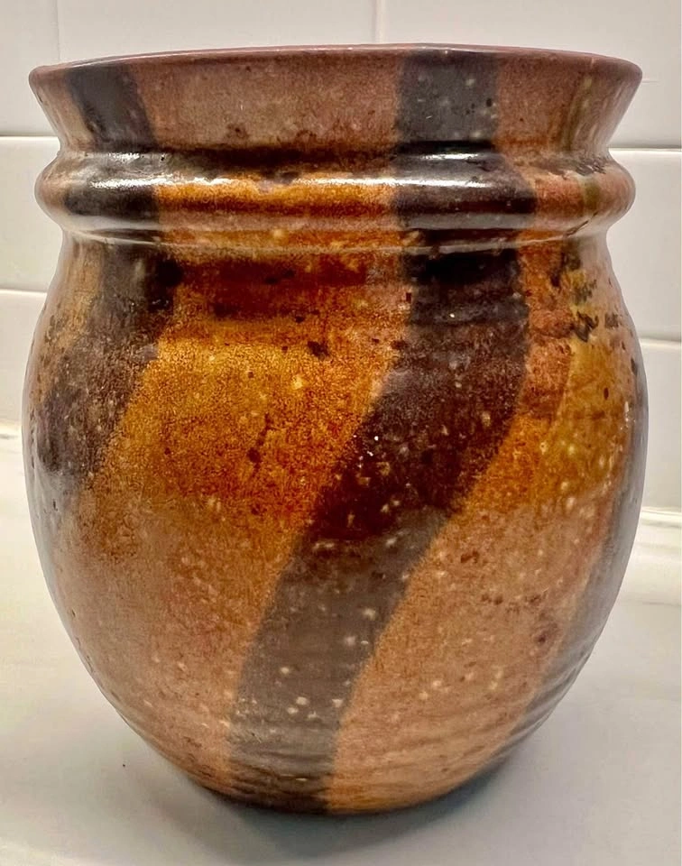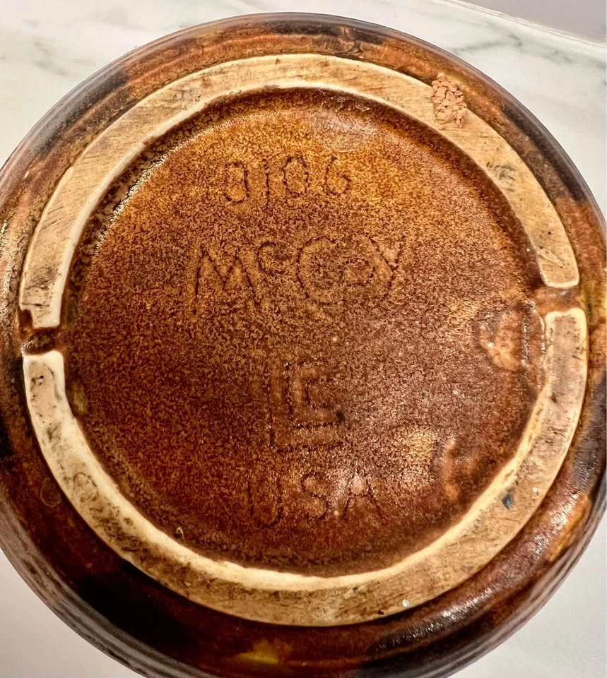 60VTG Mid-Century Modern McCoy Pottery Co Brown Onyx Vase Marbled Burnt Orange Cream, Signed.