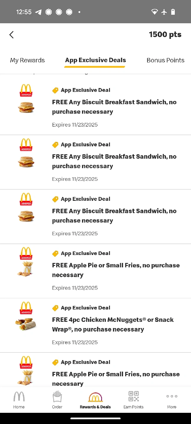 55I will order from your nearest McDonald's and you can pick up. Pay me $1 via Zelle for each deal No need to meet I'm selling McDonald's App Exclusive Deals! These deals include free biscuit breakfast sandwiches, apple pie or small fries, and 4pc chicken McNuggets or Snack Wrap. They all expire on November 23, 2025