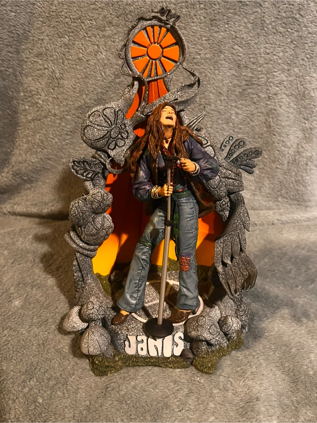 60Get your hands on this fantastic McFarlane Toys Janis Joplin statue from 2000! This highly detailed figure captures the iconic rock legend in a powerful performance pose, complete with her signature bohemian style. The statue features Janis Joplin belting out a tune, standing on a custom base with "JANIS" prominently displayed. The figure and the intricate stand are both in great condition, ready to be a centerpiece in any music memorabilia collection. Please note: The included mic stand is present, but the small microphone accessory is missing. No other accessories are included with this listing. Features: • Authentic McFarlane Toys collectible from 2000 • Depicts Janis Joplin in a dynamic singing pose • Figure and custom display stand are in great condition • Perfect for collectors of music memorabilia and rock and roll legends