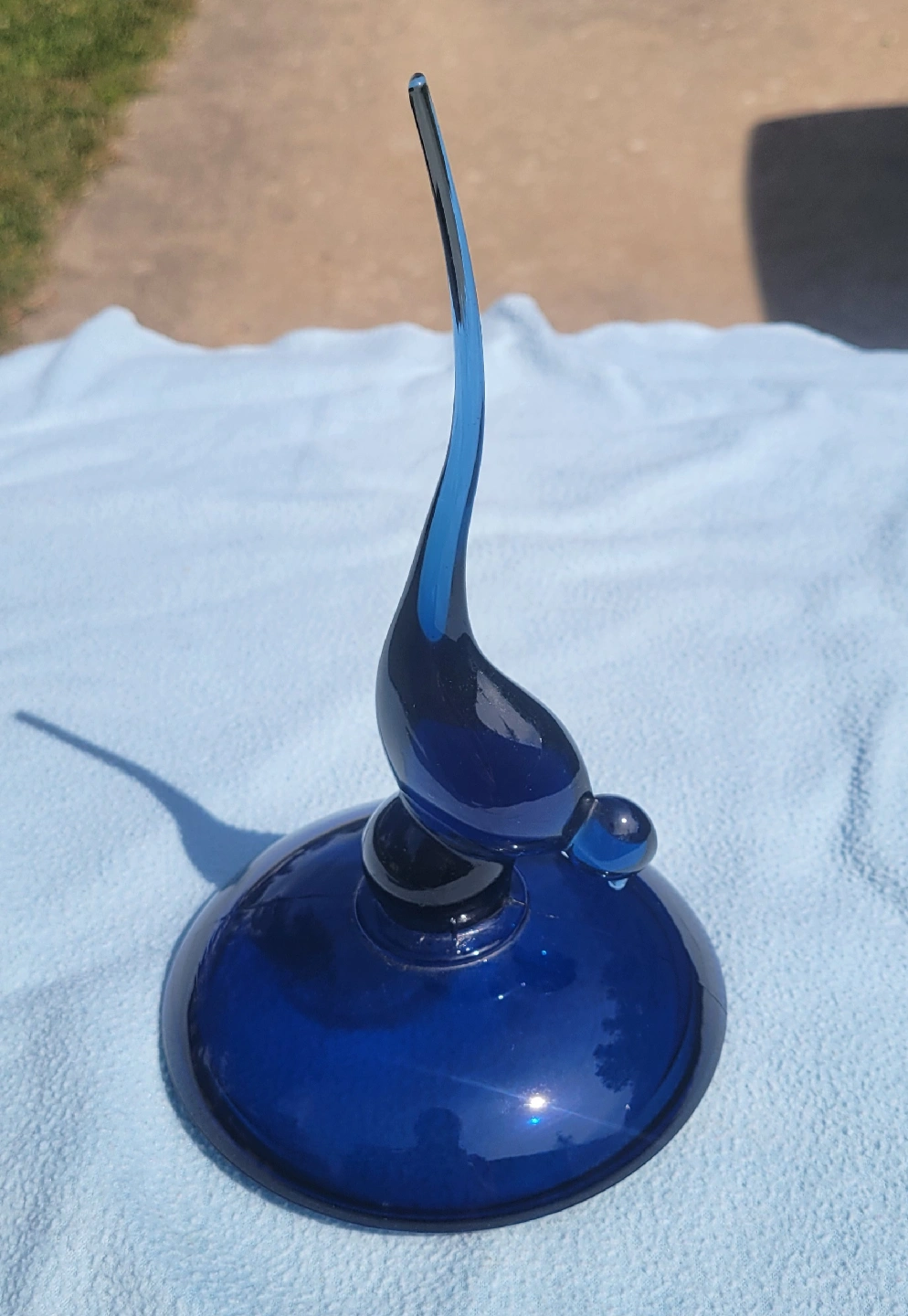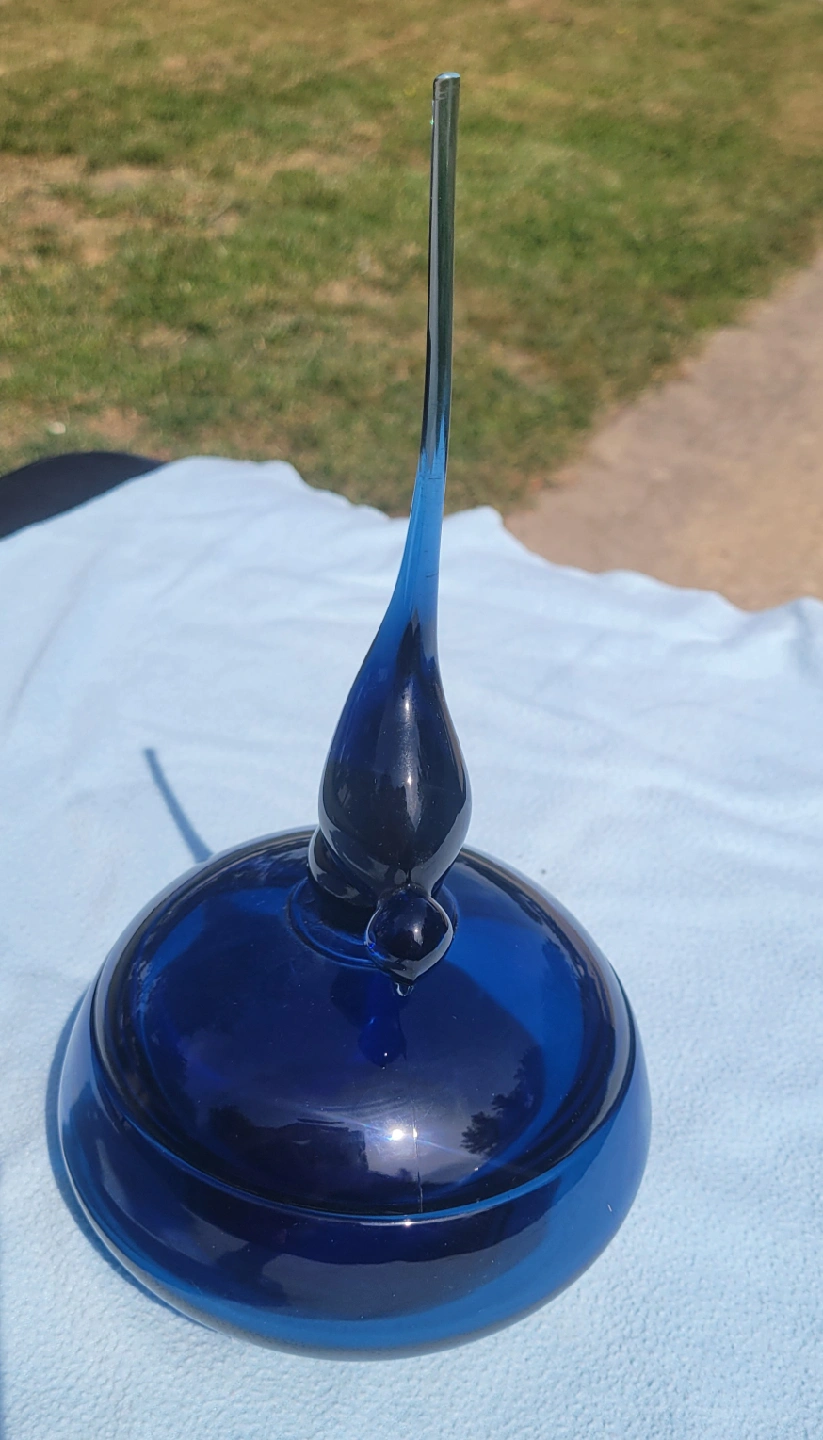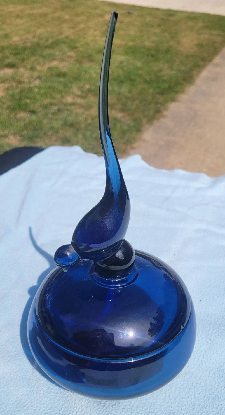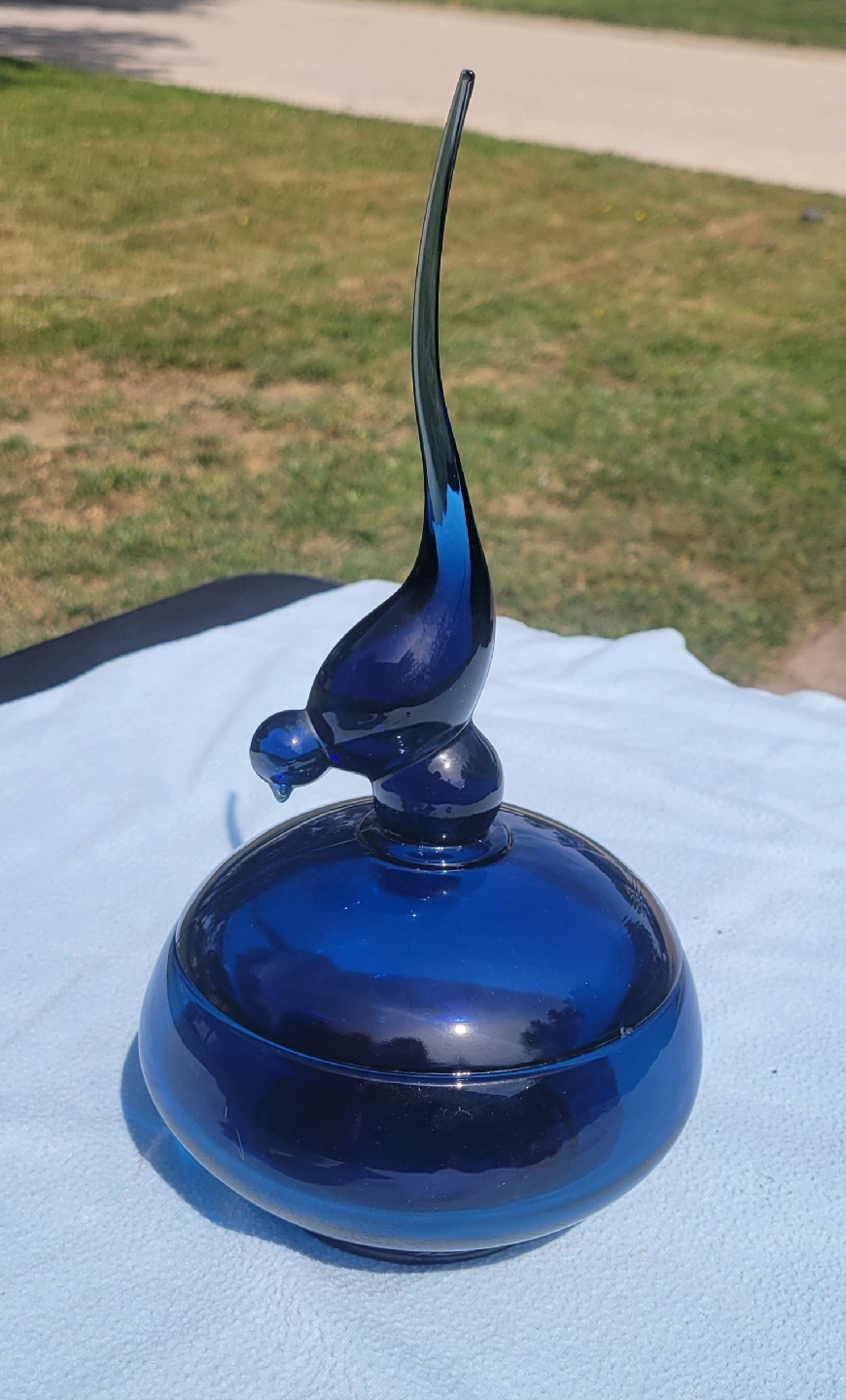 Here's a beautiful blue glass trinket dish featuring a bird design! It's perfect for storing small items or simply as a decorative piece.
