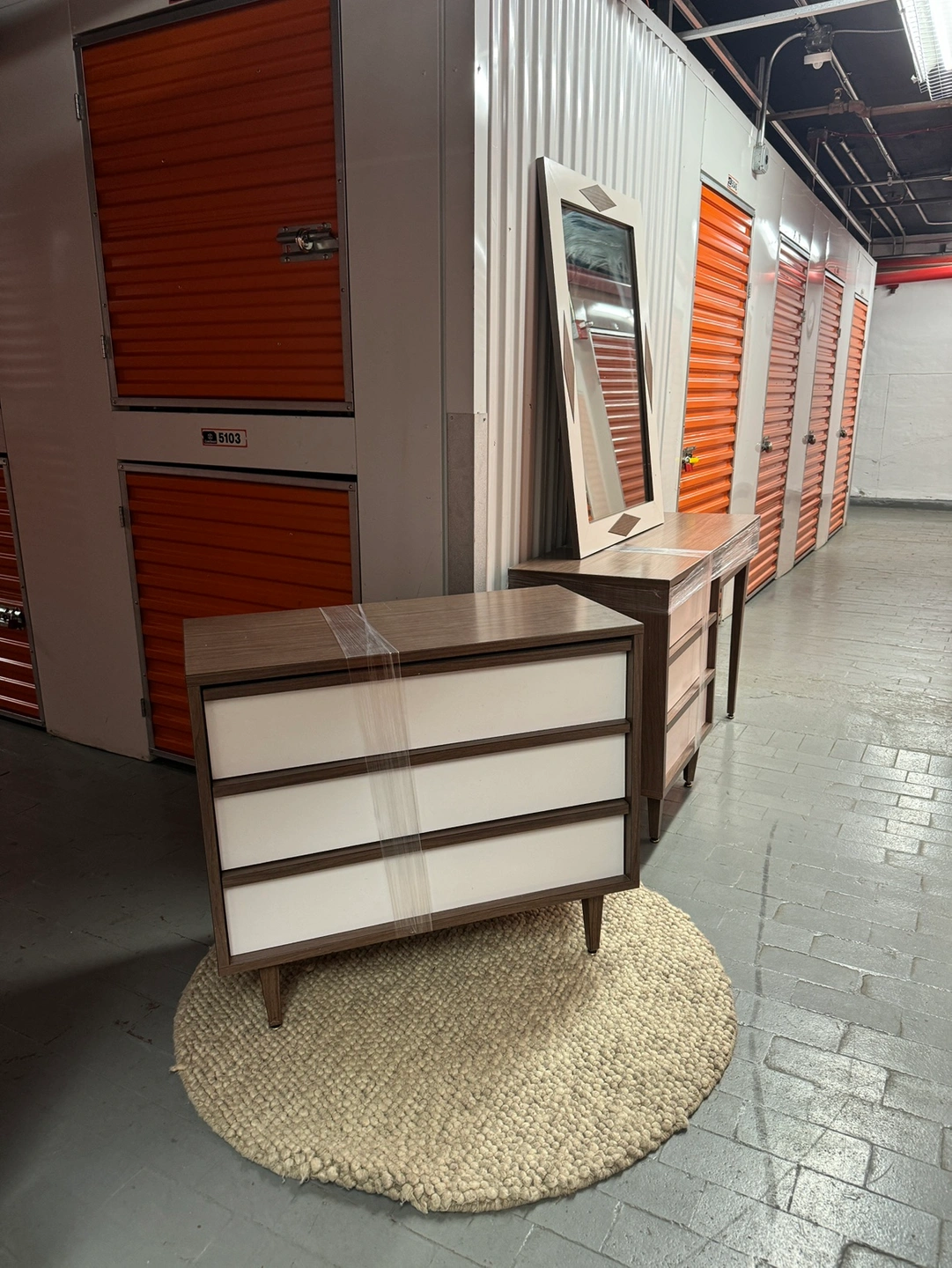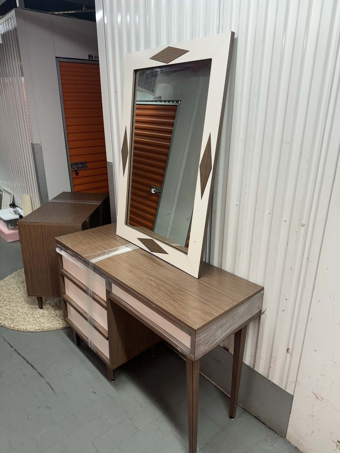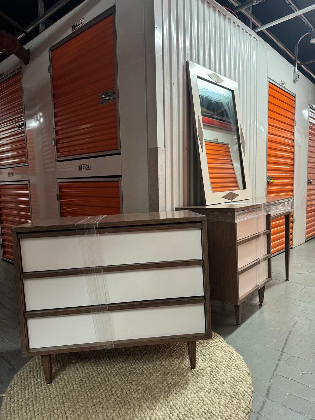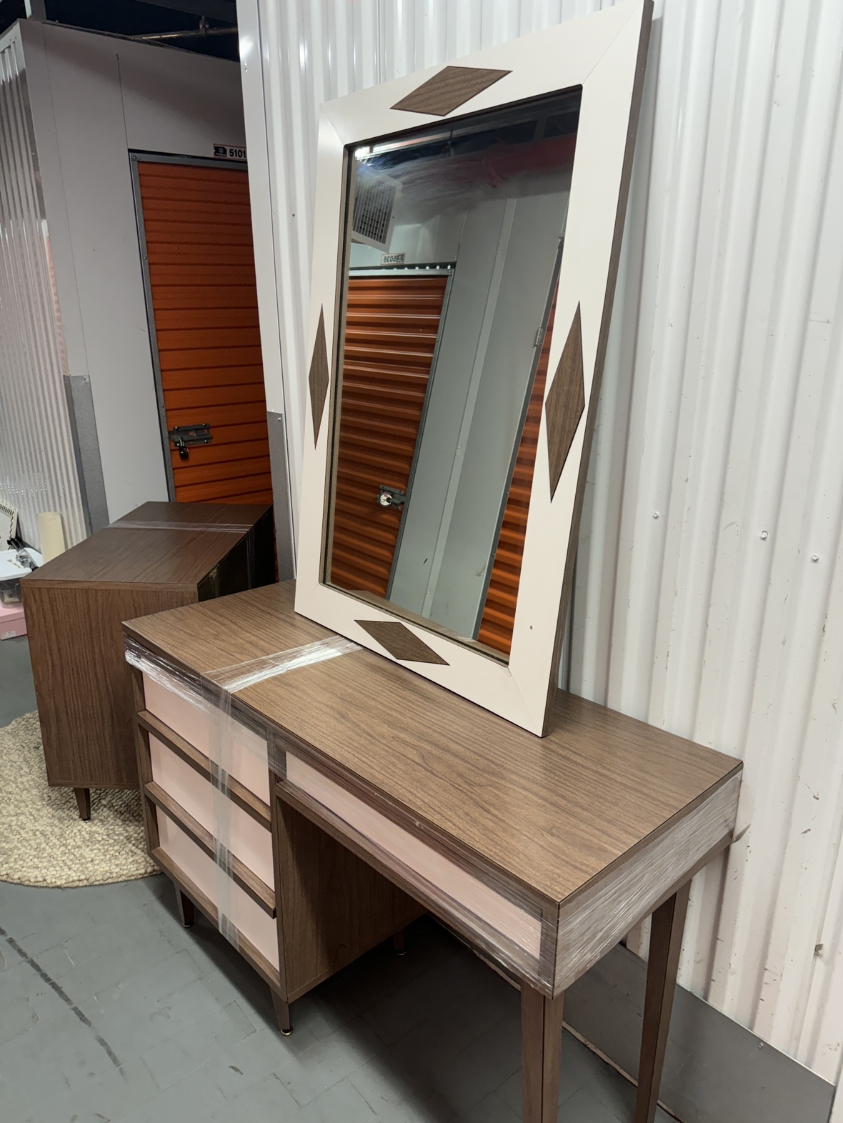 15Mirror - 30” W x 42” H Dresser - 36” w x 18” d x 31” h Desk - 48” w x 18” d x 31” h 28” seat height Really cute true vintage mcm set, just doesn’t work in my new apartment. Has some wear and tear that’s accurate to its age but still very functional!