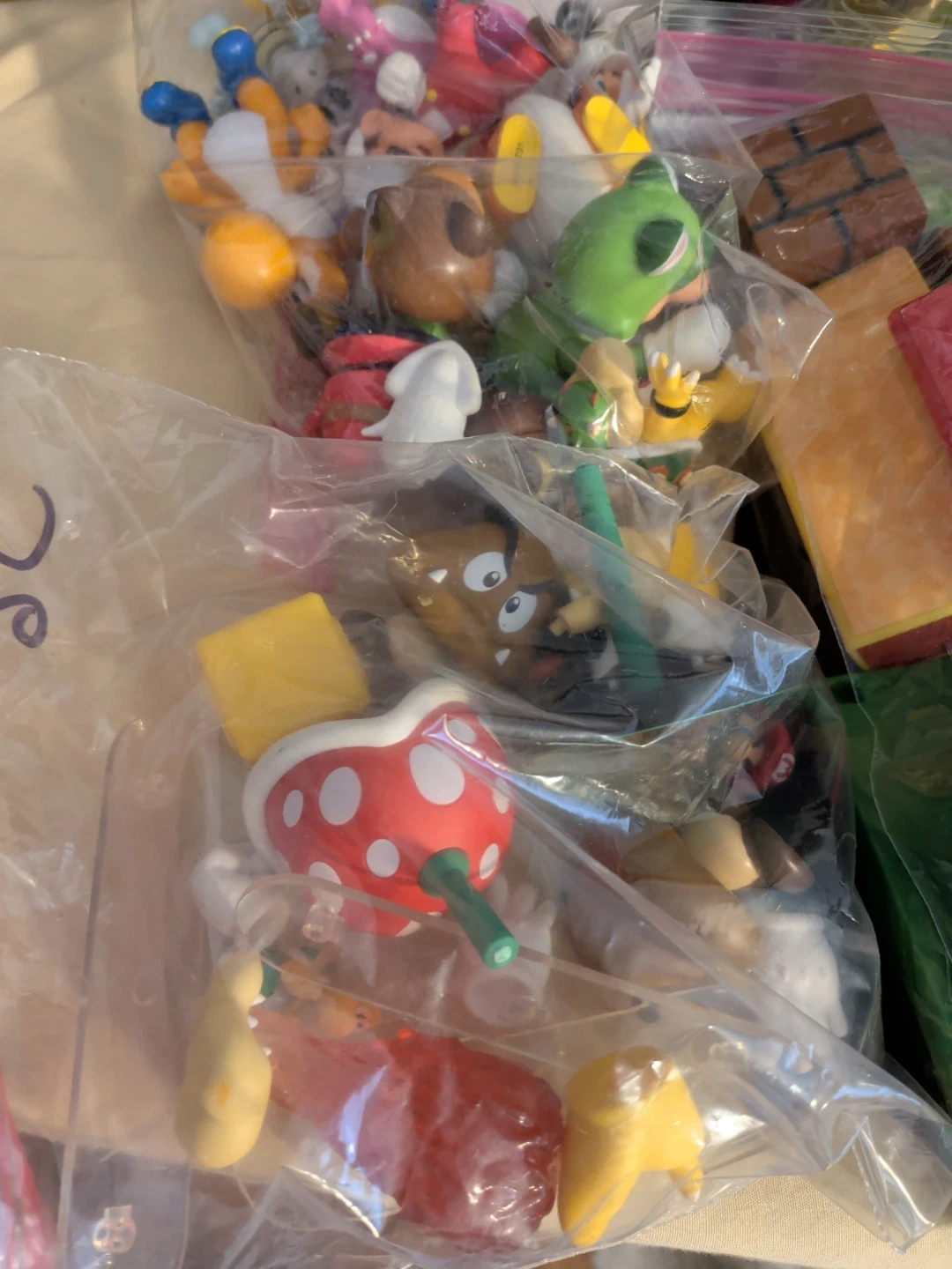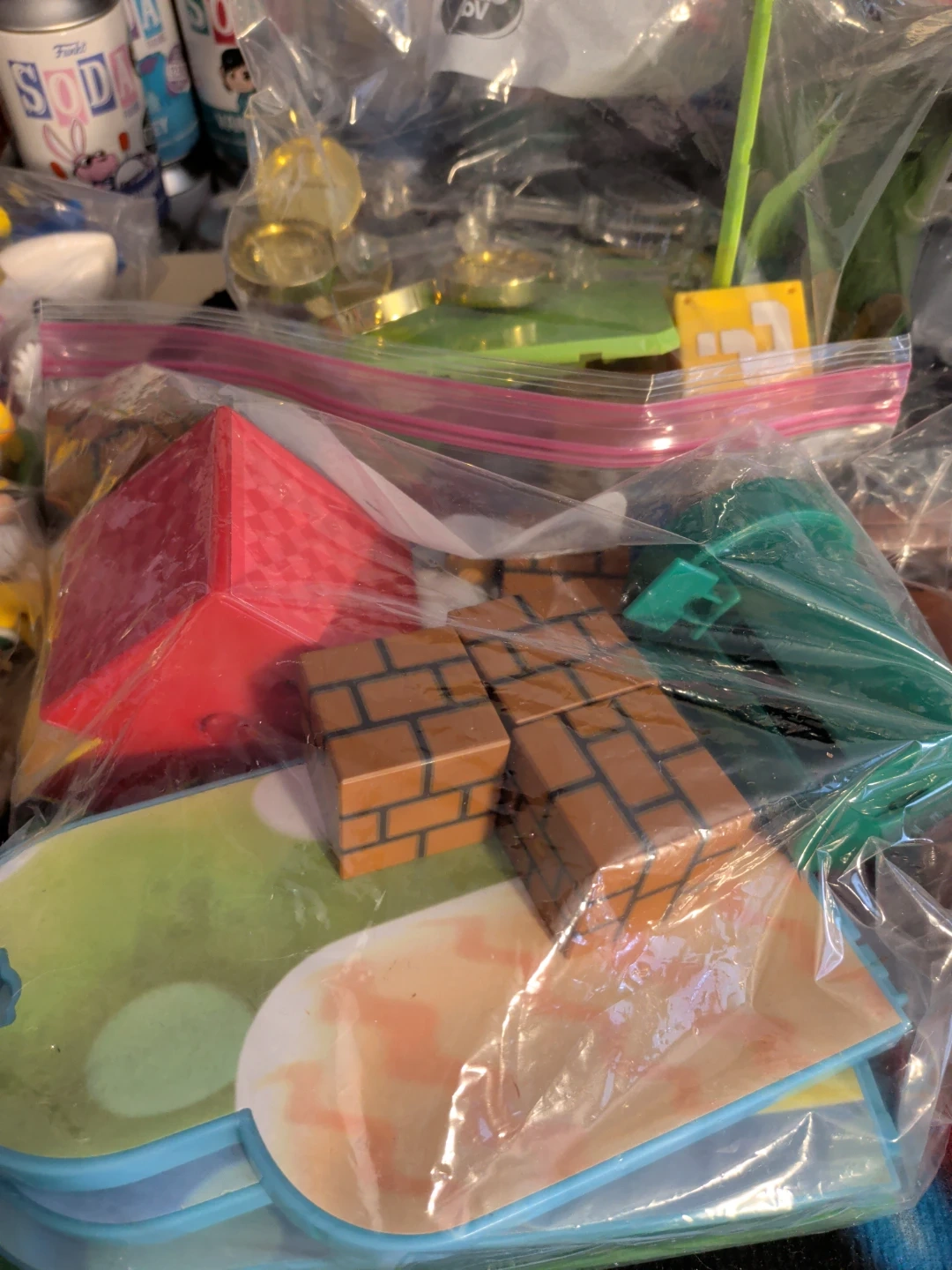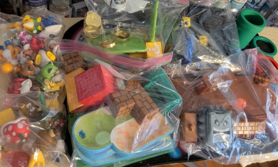 This is a collection of Nintendo Mario Kart themed building blocks and collectible figures. It includes various characters and accessories for imaginative play. Pieces include brick blocks, question mark blocks, and character figures. Used, in good condition. You can connect the sets together. Great display piece.