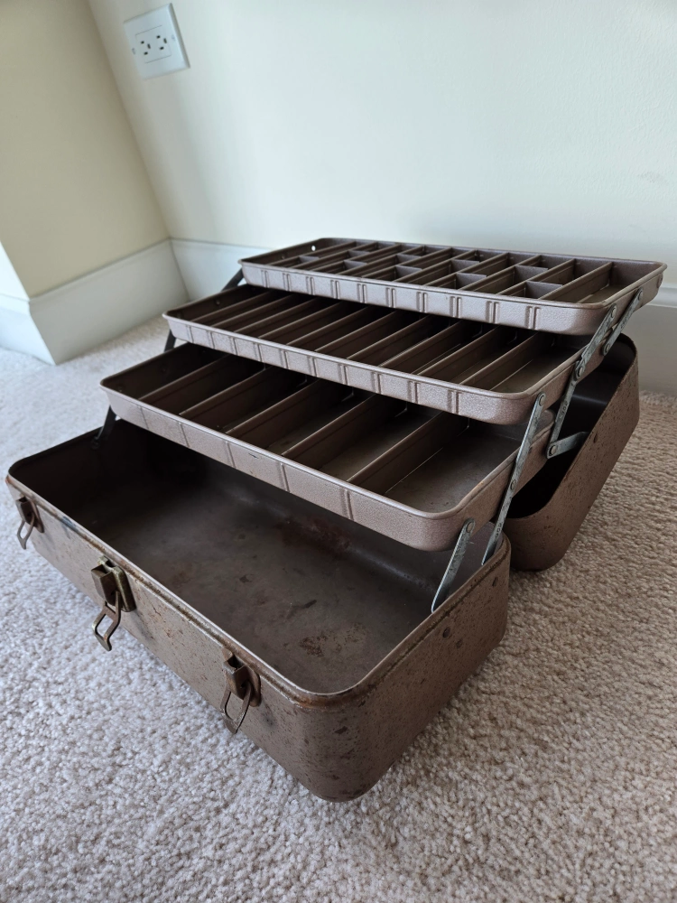 Vintage metal tackle box with multiple trays. Some wear and tear on the exterior. Great for fishing or storage. Has a latch and a handle. It is approximately 15" long, almost 7' tall and 7" deep.