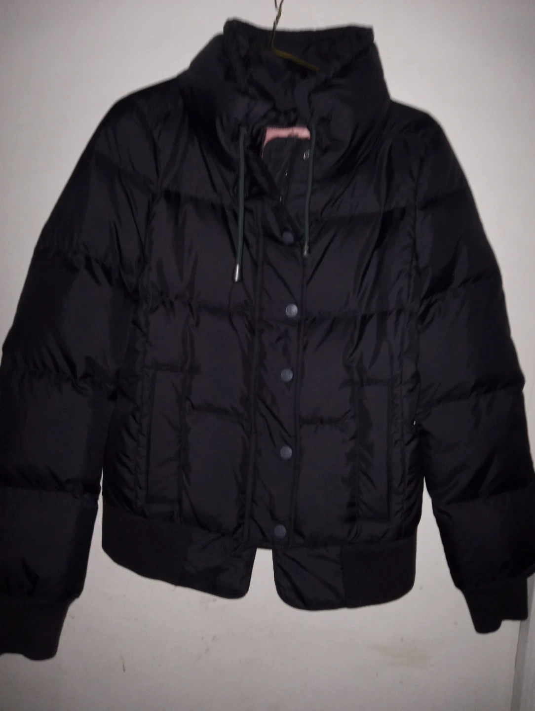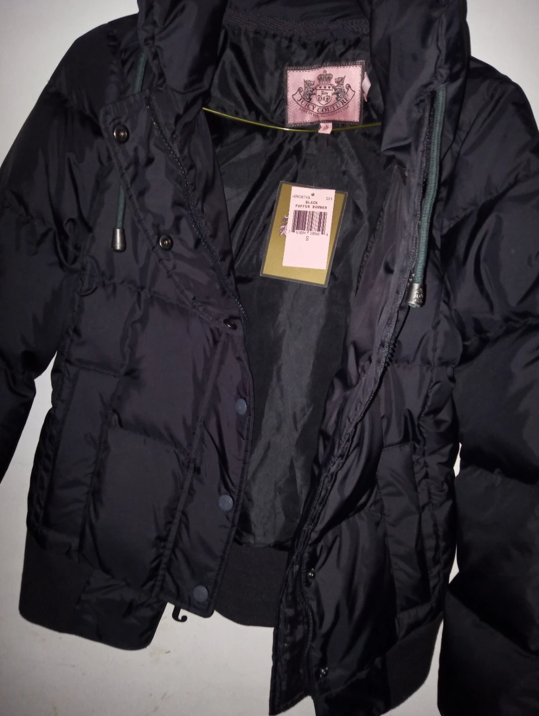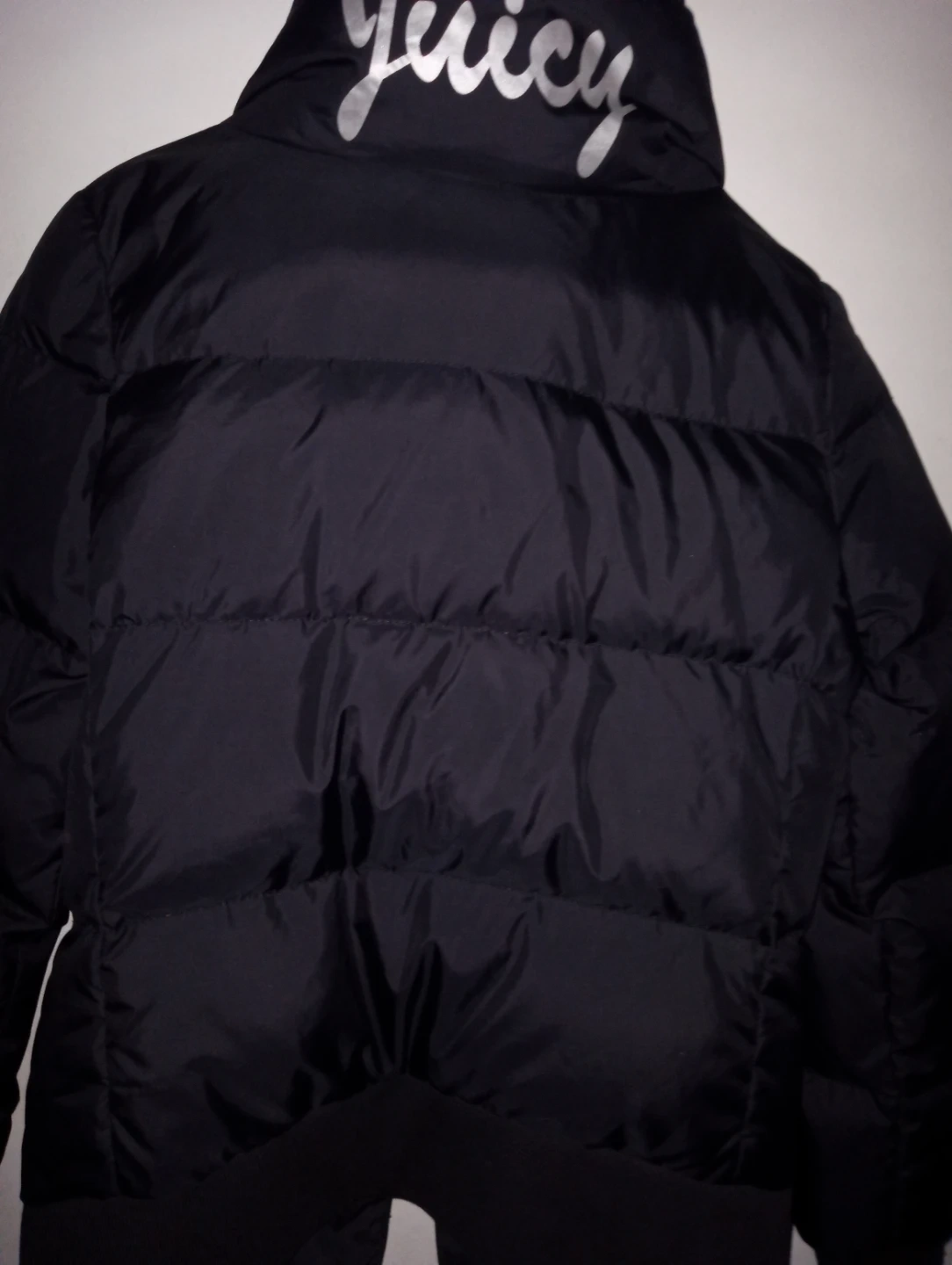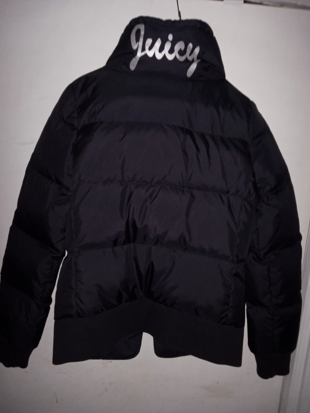 This is a Juicy Couture black puffer jacket. It features a stand-up collar and button closure. The "Juicy" logo is printed on the back collar.