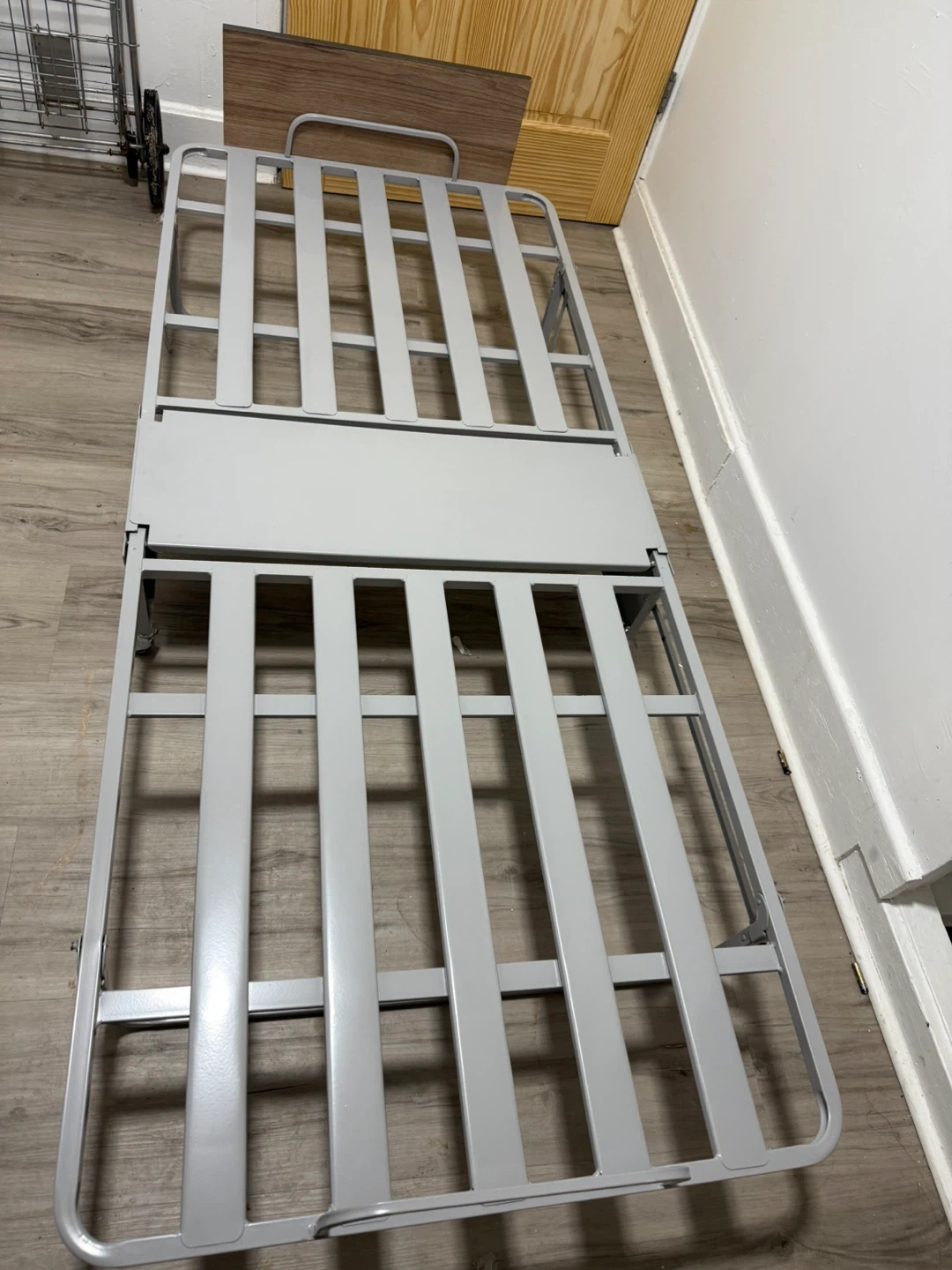 This is a folding bed frame with a wood-look headboard. It's made of a durable metal frame and includes wheels for easy transport. The frame is designed to fold for compact storage.