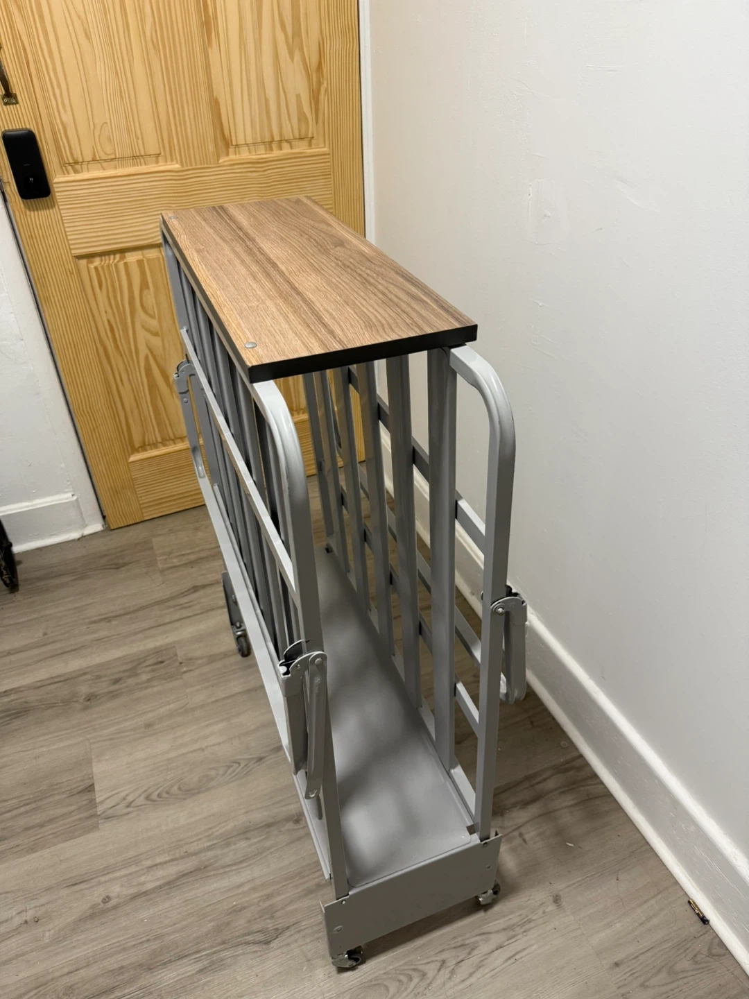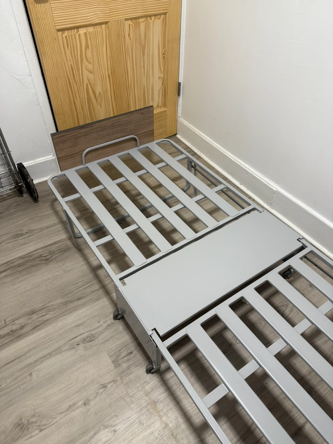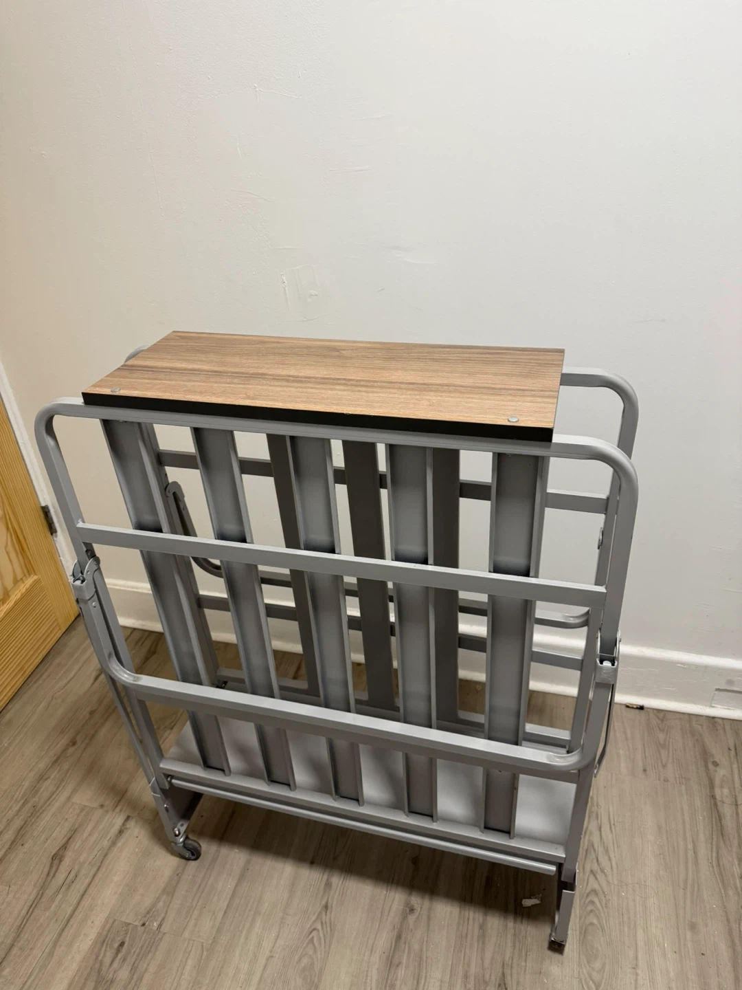This is a folding bed frame with a wood-look headboard. It's made of a durable metal frame and includes wheels for easy transport. The frame is designed to fold for compact storage.