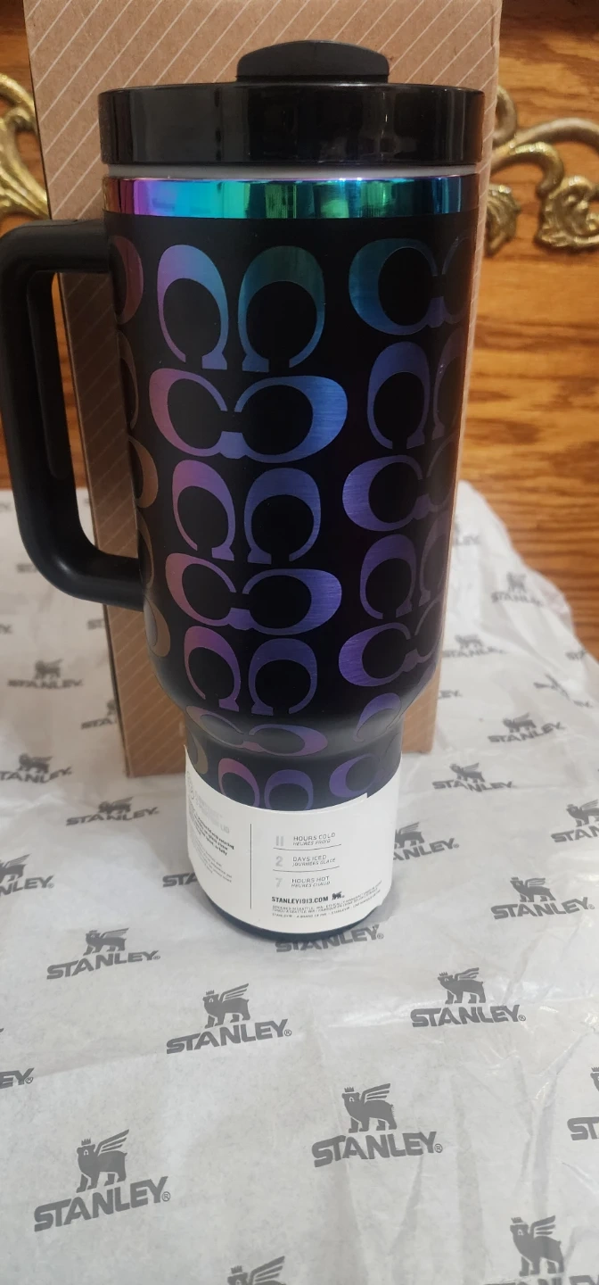 This is a Stanley "C" logo tumbler, a collaboration with Coach. It features a double-wall vacuum insulation and a comfort-grip handle. The tumbler holds 30 oz.