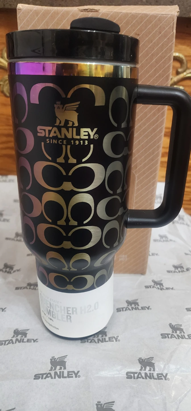 This is a Stanley "C" logo tumbler, a collaboration with Coach. It features a double-wall vacuum insulation and a comfort-grip handle. The tumbler holds 30 oz.