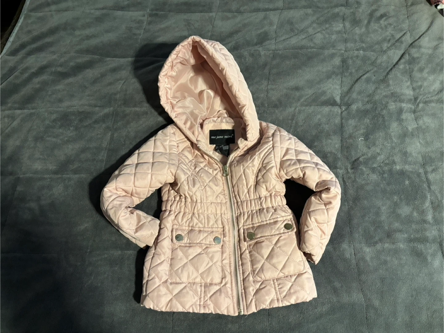 This is a cute Me Jane Mini quilted jacket for girls. It's a light pink color and features a quilted design with a hood and pockets. Perfect for keeping your little one warm and stylish!