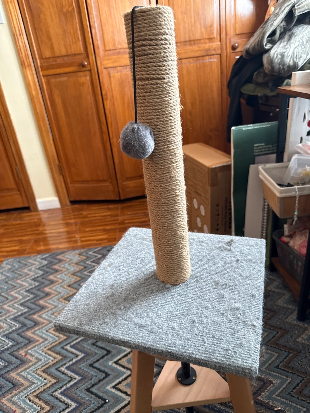 This scratching post is covered in durable sisal rope for your cat to sharpen their claws. It features a carpeted base and a dangling toy for added entertainment. Sisal rope and carpet material.