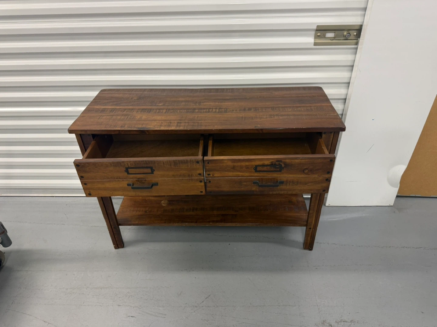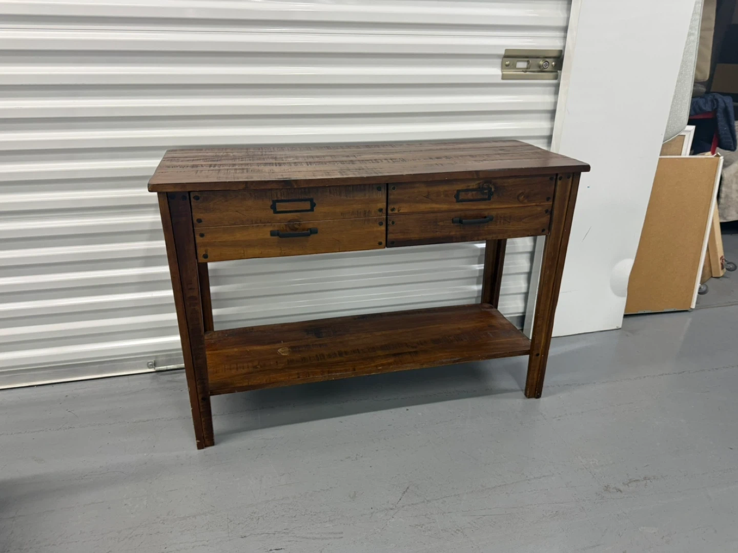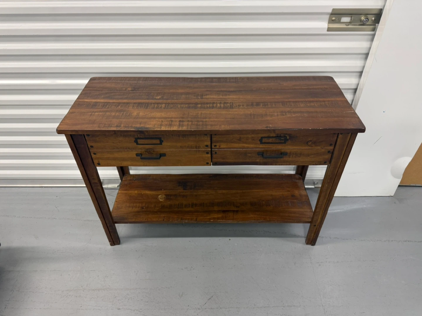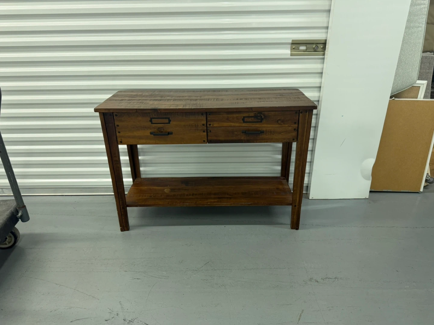 This console table is made of wood with a rustic finish. It has two drawers for storage and a lower shelf. Black metal drawer pulls add a decorative touch.