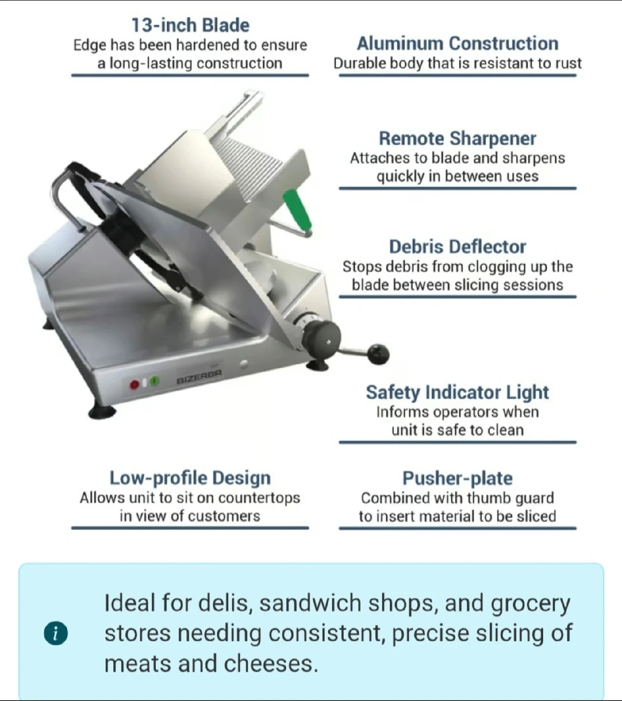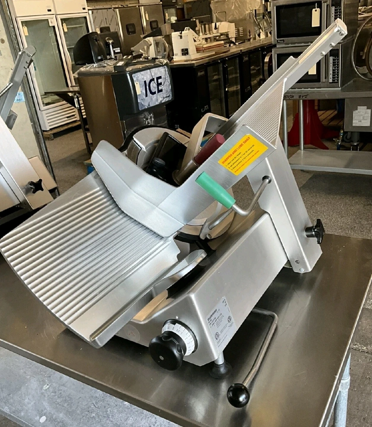 97In really good condition deli meat slicer. Retails almost $5,000! Asking $1,500 or best offer!! Dimensions & Utilities Blade: 13-in. diameter Overall: 2827/50 in. L x 231/20 in. W x 233/8 in. H 3.5 A, 360 W 120 V/60 Hz/1 ph, includes 6-ft. cord Product Details Slice thickness: 0-24-mm. thick, Slice thickness can be adjusted by 1/100-of-an-inch Chromium-coated, 60-62 Rockwell toughened blade Blade speed: 319 RPM Aluminum construction is seamless Low-profile design 8 safety interlocks 40-degree gravity feed chamber 25-degree inclined high carriage Removable push plate and thumb guard Spring-loaded dial on remote sharpener Green pusher handle and red remnant lift arm handle 54/5-in.-wide thumb guard Front-mounted button controls UL157 gaskets and seals Debris deflector is permanently mounted in place Light up gauge relays blade status