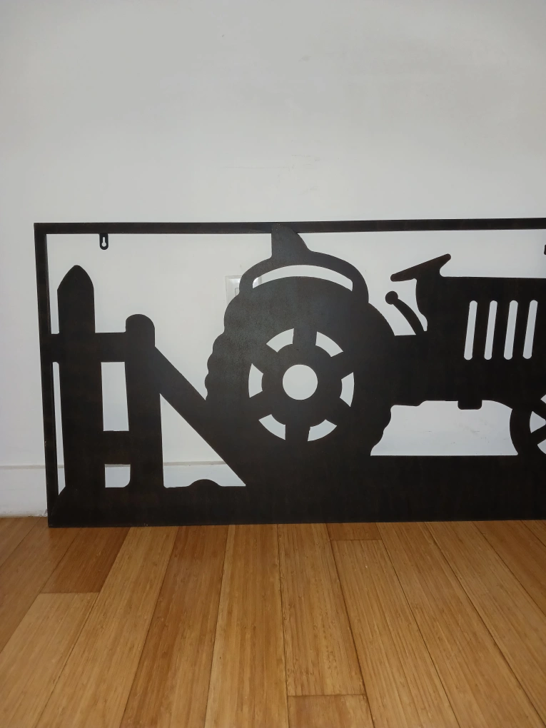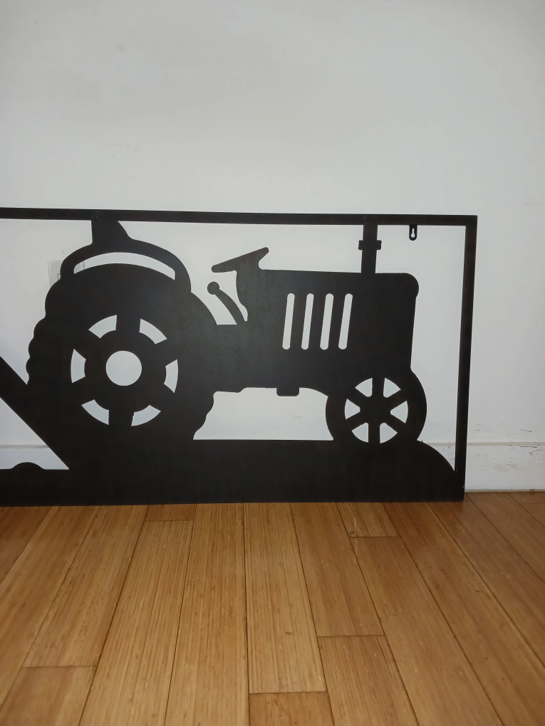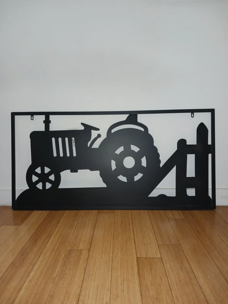 Add a touch of rural charm to your decor with this farm-themed metal wall art panel. Showcasing a striking silhouette of a classic tractor beside a wooden fence, this piece celebrates the hardworking spirit of country life and agriculture. Material: Heavy-duty, black powder-coated metal for durability and a sleek finish Design: Cut-out silhouette of a tractor next to a picket fence with bold, clean lines Mounting: Equipped with hanging hooks for easy wall installation Perfect For: Farmhouse interiors, barns, garages, man caves, or rustic outdoor spaces Whether you're a tractor enthusiast, farmer, or country living lover, this artwork brings timeless character and strength to any space. A great gift idea for those who appreciate vintage machinery and rural heritage.