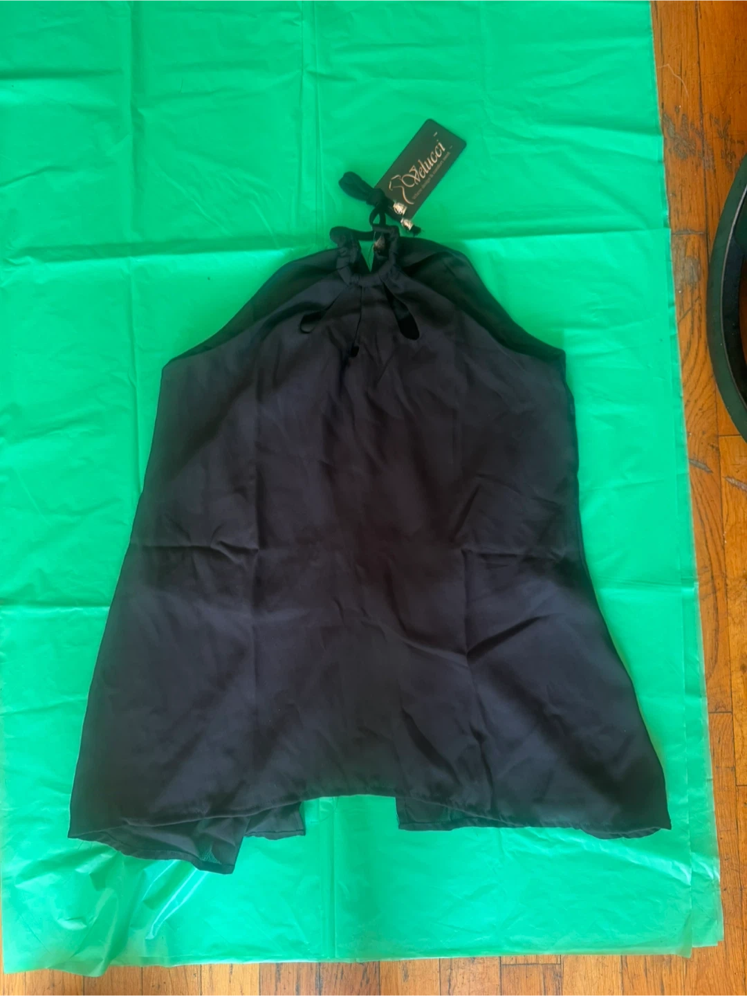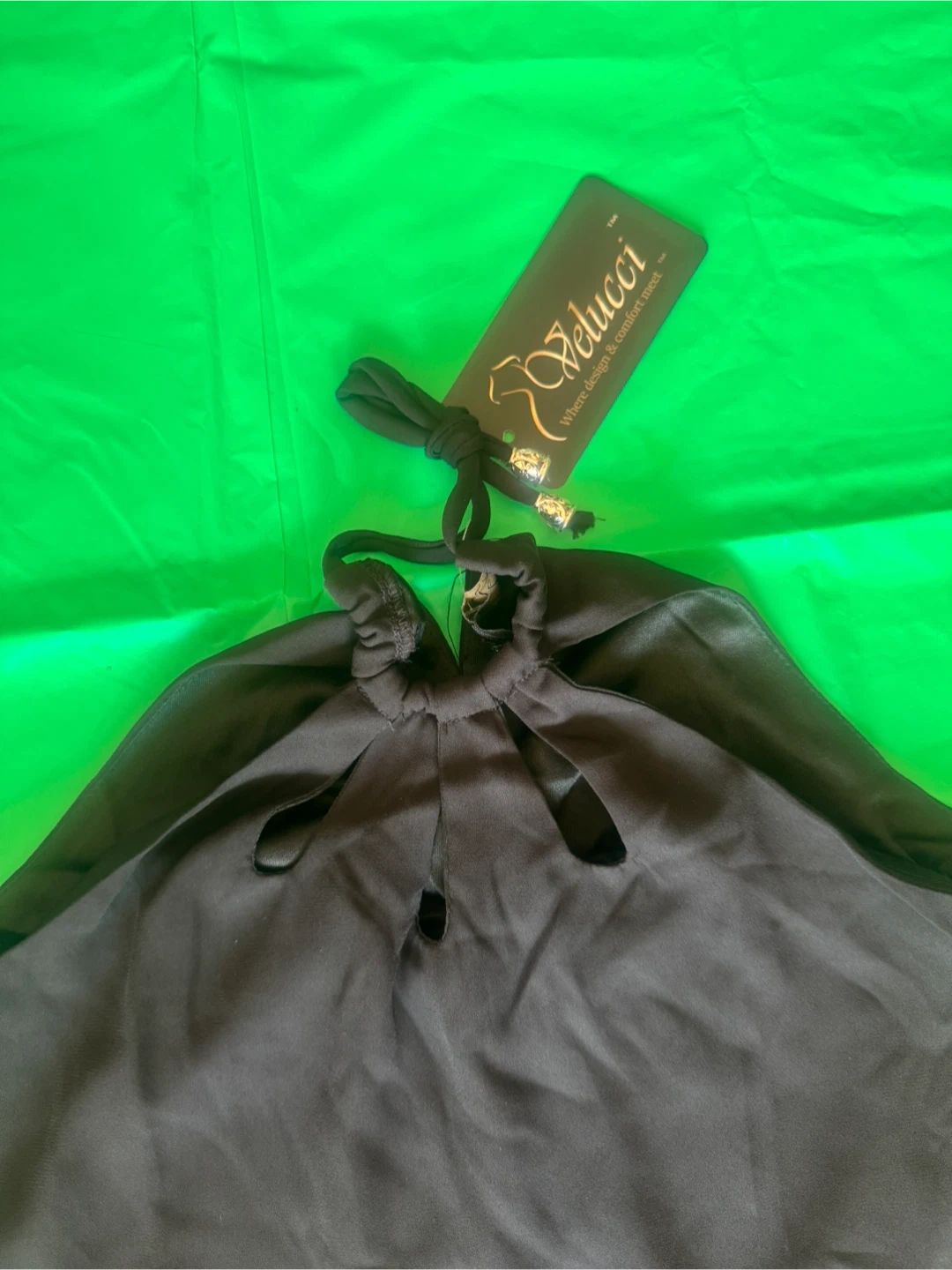 Esta es una cubierta de cuello halter negro de Velucci. Está hecho de un tejido ligero y cuenta con un cierre de corbata en el cuello. El dobladillo tiene recortes decorativos. Talla S y M llévala la q desees en $5