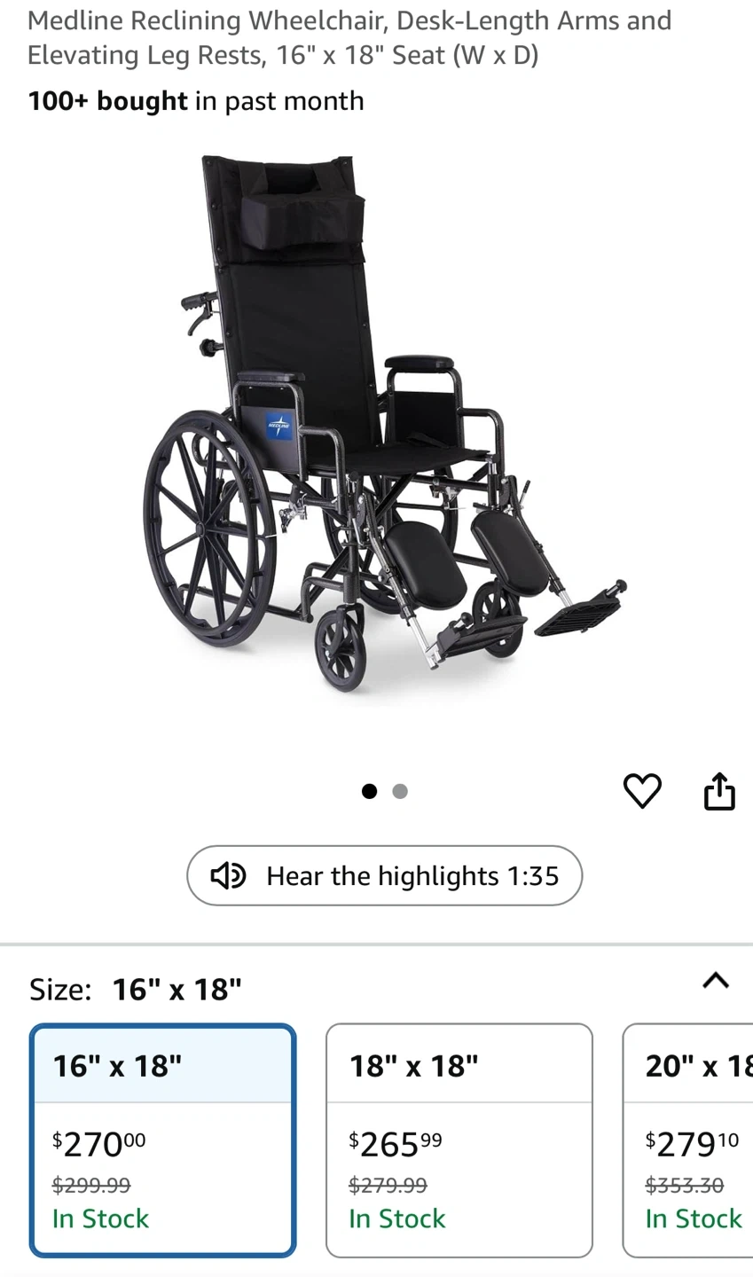 Selling a Medline reclining wheelchair with desk-length arms and elevating leg rests. The seat size is 16" x 18". I bought this for $270
