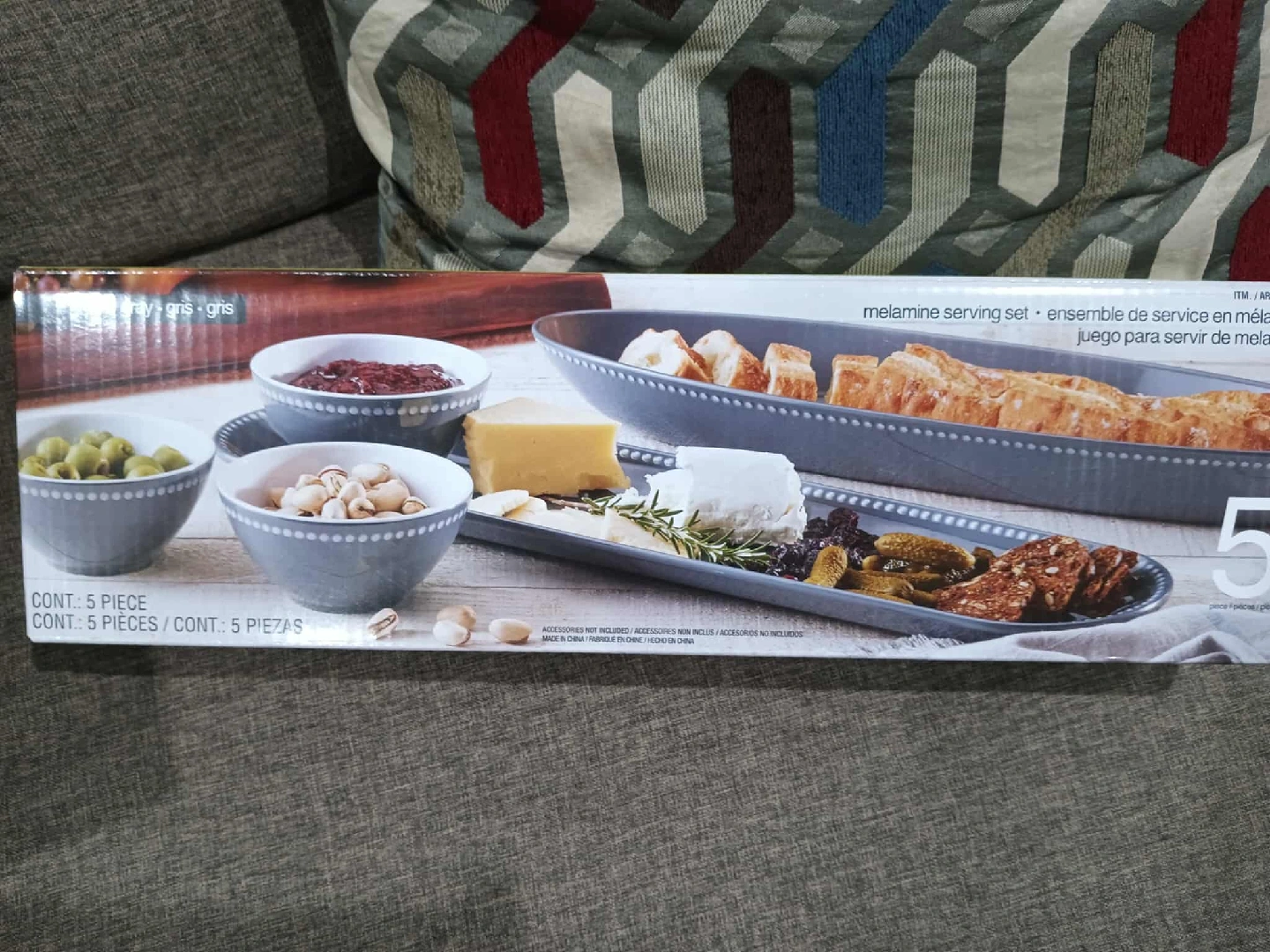 Selling a 5-piece melamine serving set! It's perfect for entertaining or everyday use. The set includes various bowls and platters, ideal for serving appetizers, snacks, or desserts. The gray color adds a touch of elegance to any table setting. Gray in color.