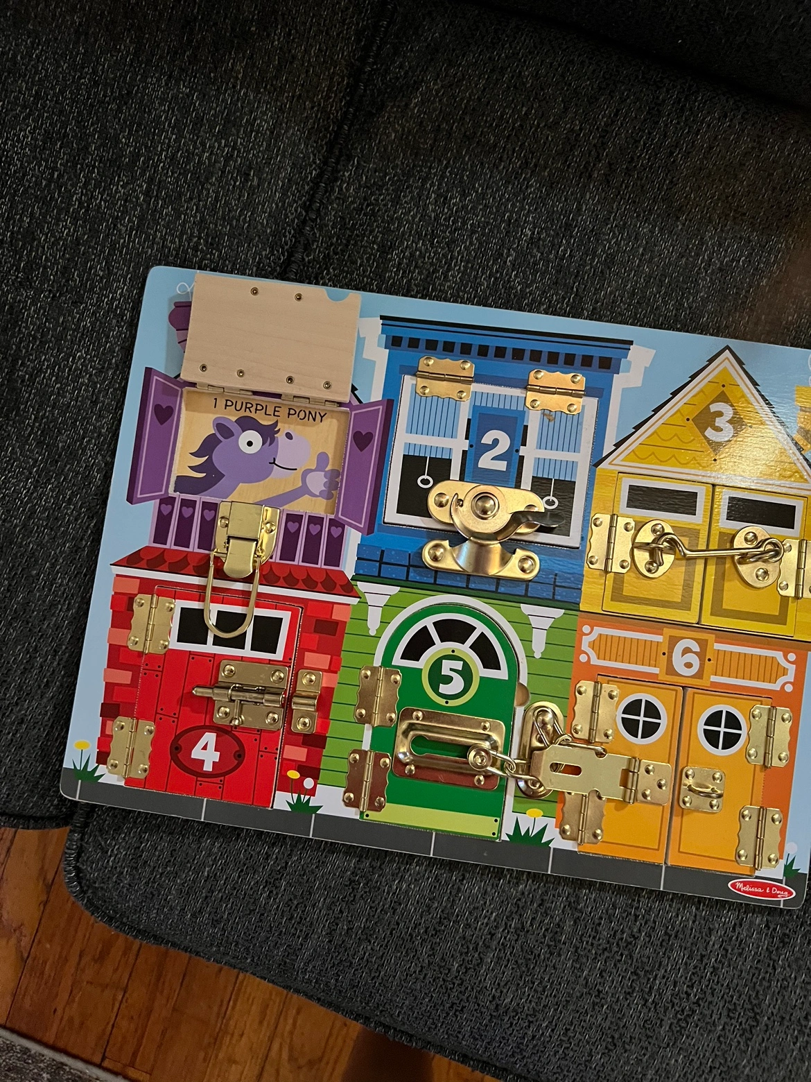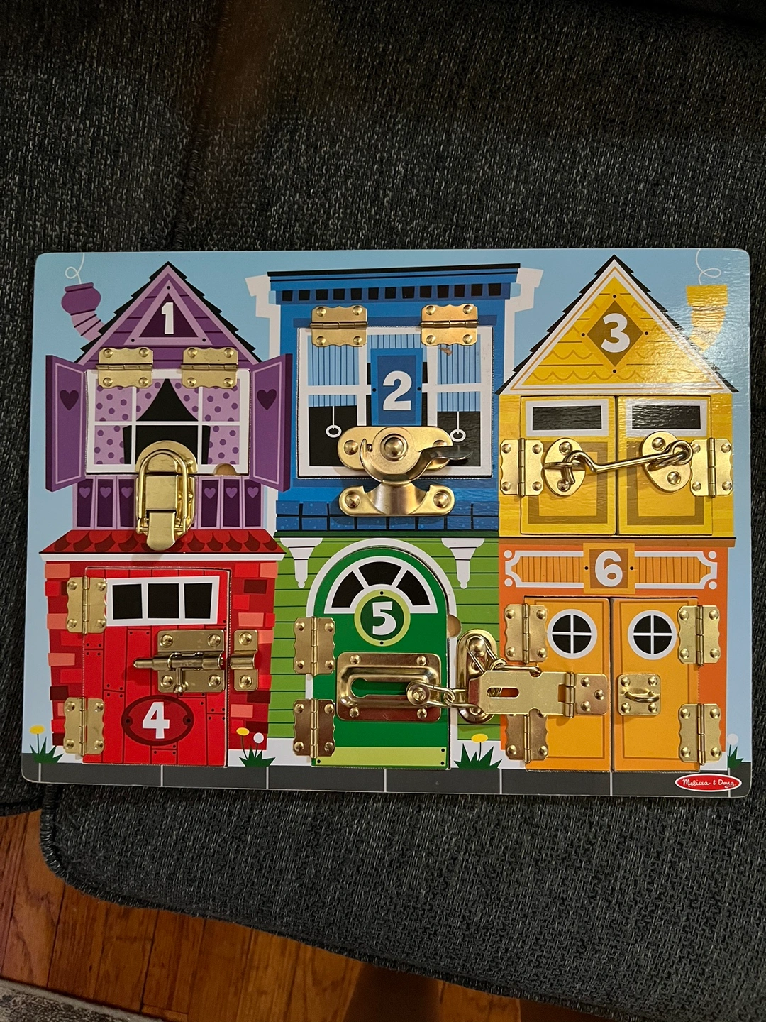 Wooden toy with 6 doors that have different latches, hinges, and locks. Perfect for developing fine motor skills. Learn numbers as well $10