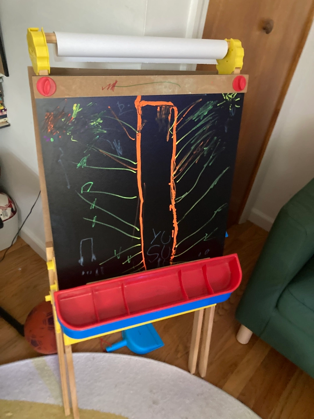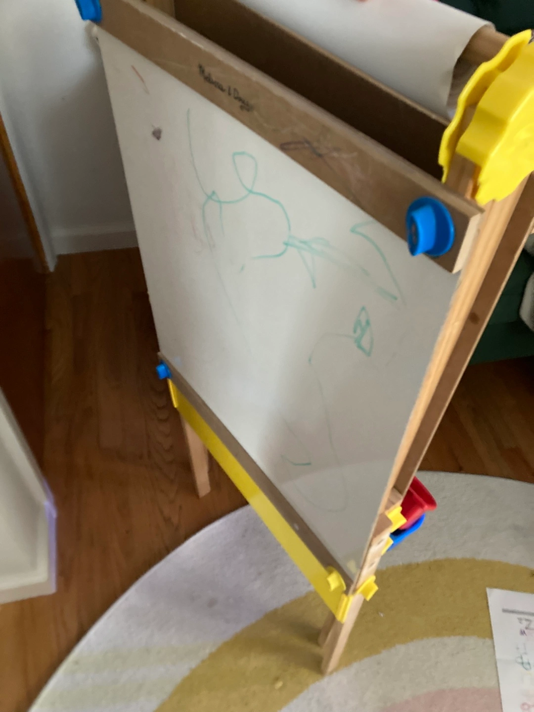 83I'm selling a Melissa & Doug kids' art easel! It's a great way to encourage creativity and artistic expression in children. It features a chalkboard on one side and a whiteboard on the other, providing versatile options for drawing and painting