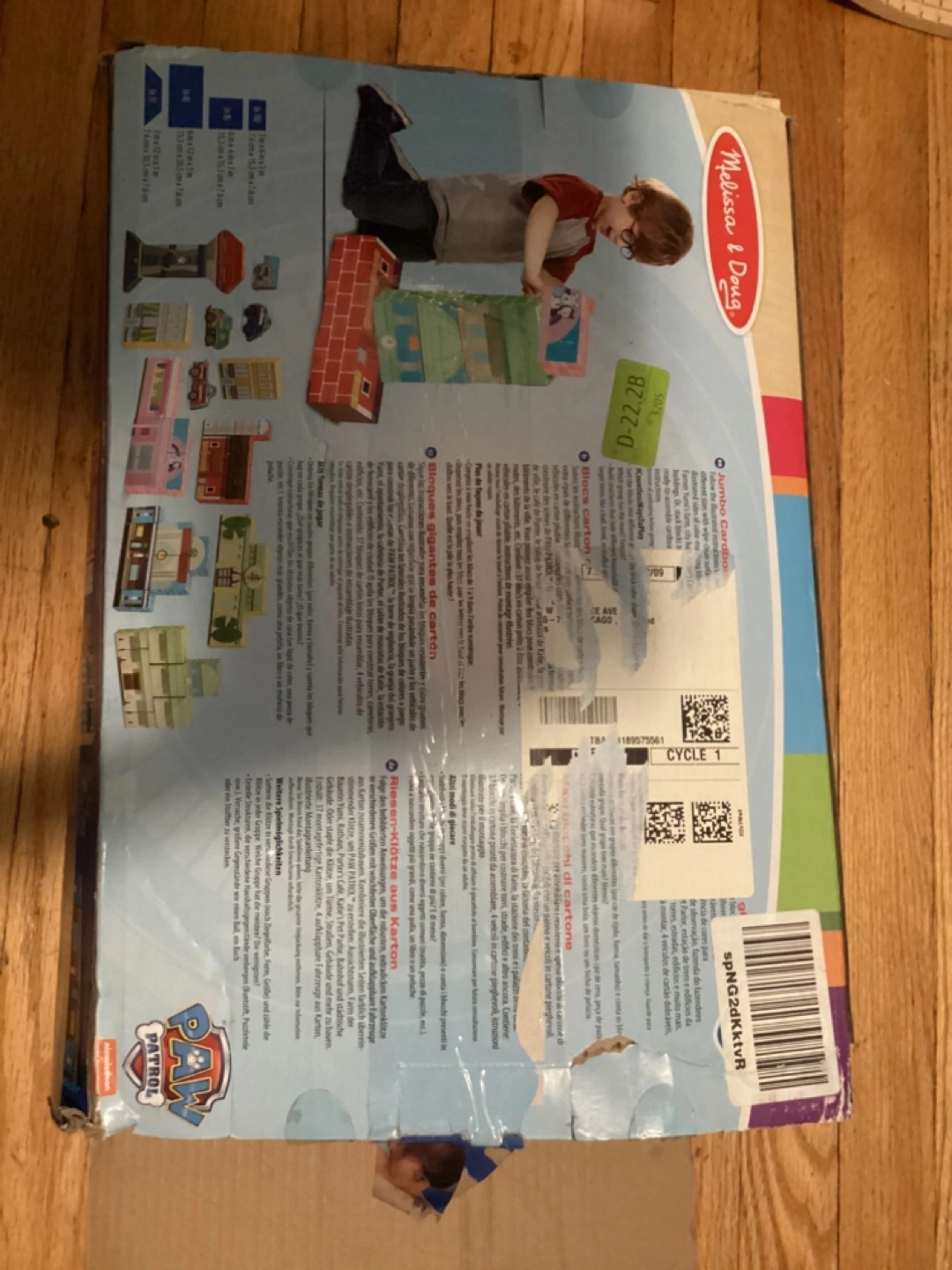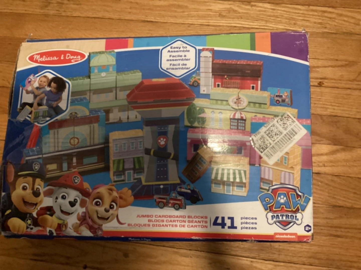 Cardboard block set. Easy assembly. Features Paw Patrol characters. Great for imaginative play. Opened but barely used.