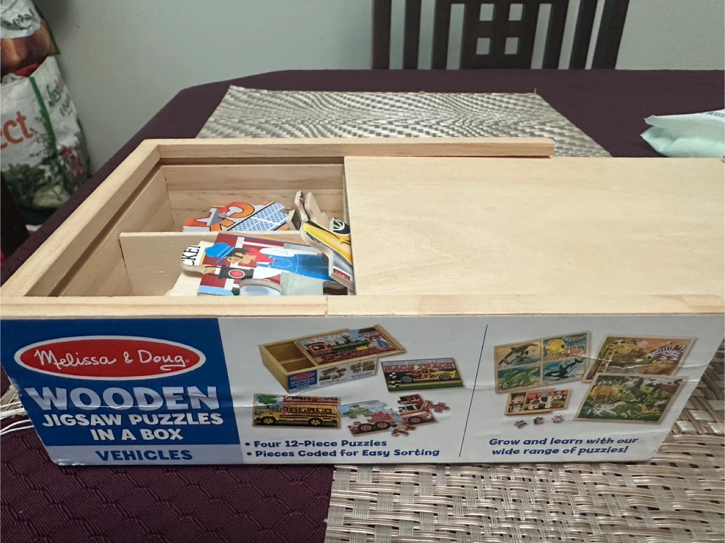 Selling a Melissa & Doug wooden jigsaw puzzle set in a box! This set features a vehicle theme and includes four 12-piece puzzles. The pieces are coded for easy sorting, making it great for young children learning to grow and learn with a wide range of puzzles