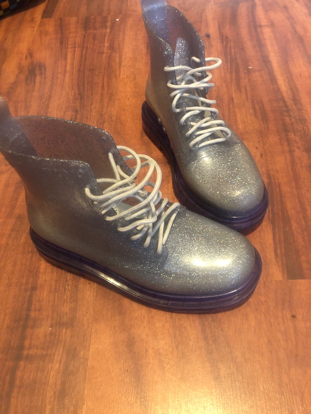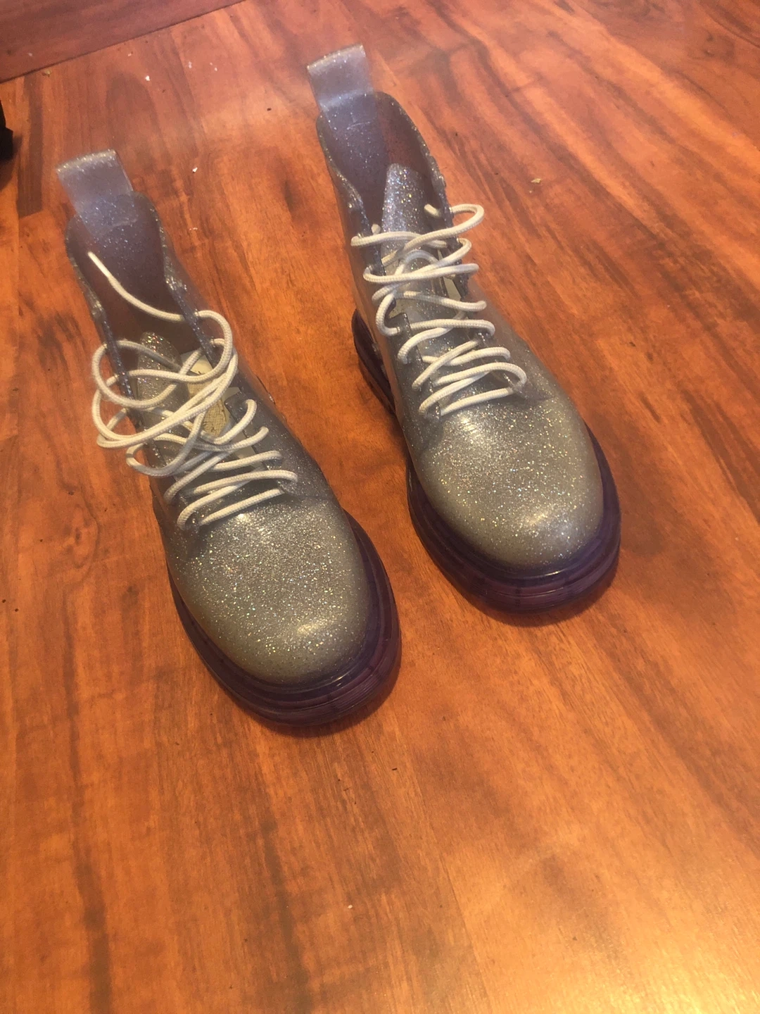 65These are a pair of glittery rain boots from Melissa! They have white laces and a purple sole. Perfect for adding some sparkle to a rainy day