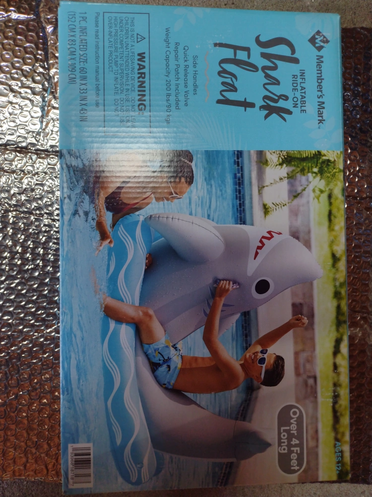 10Inflatable ride on, over 4 feet long. Side handles, quick release valve, and repair patch included. Weight capacity 200 lbs.