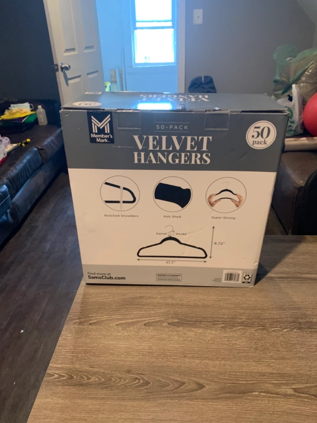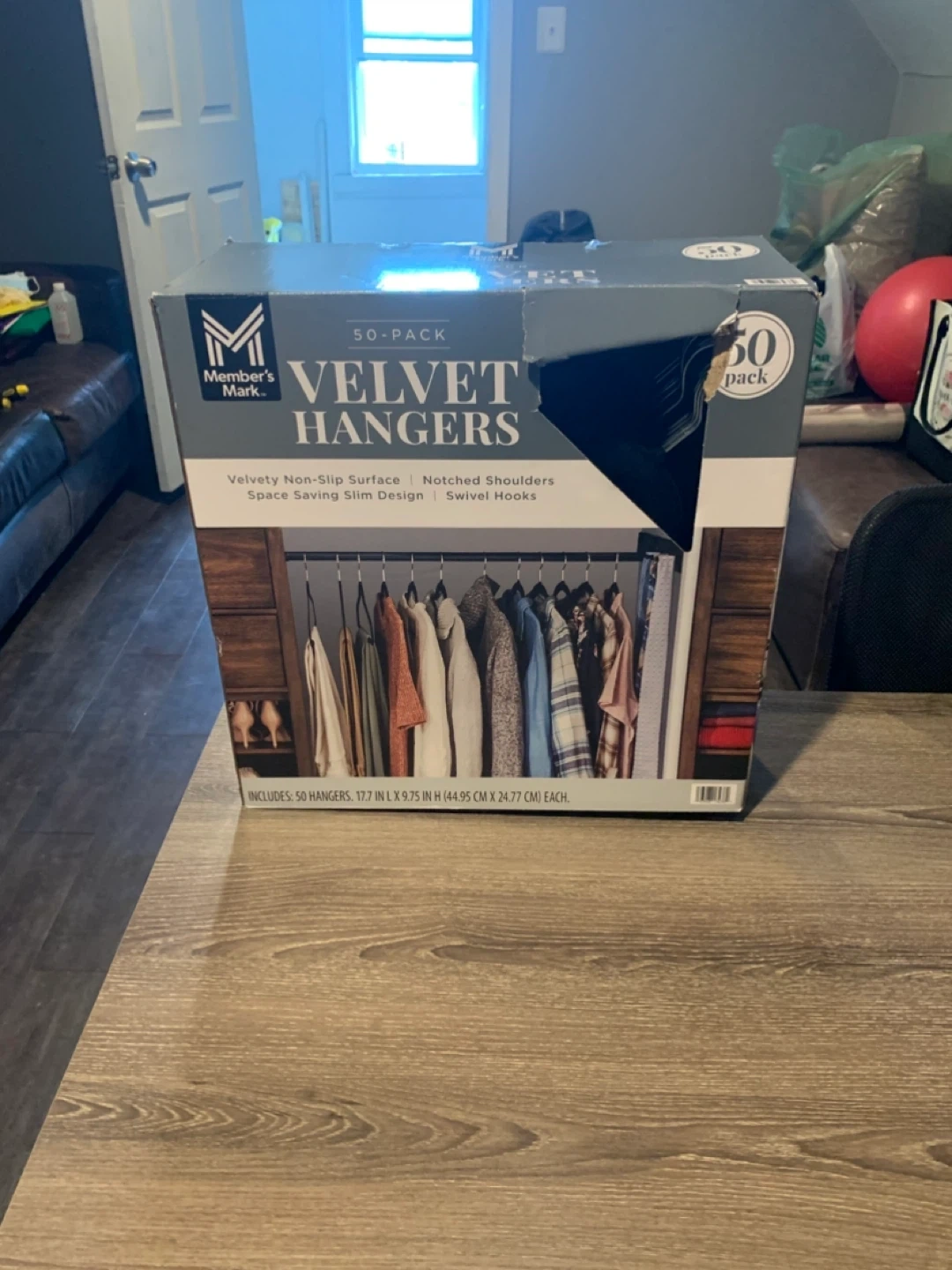 Selling a 50-pack of Member's Mark velvet hangers. These hangers feature a velvety non-slip surface, notched shoulders, and swivel hooks. They have a space-saving slim design and each hanger measures 17.7 in L x 9.75 in H x 24.77 cm