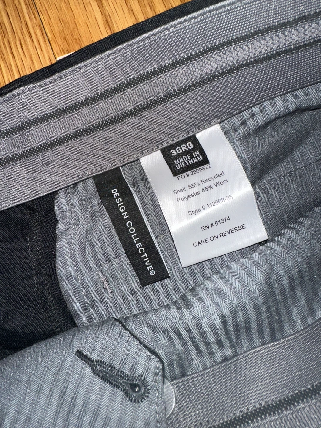 Selling a pair of Design Collective dress pants in size 36RG. They are black and made of a shell consisting of 55% recycled polyester and 45% wool.