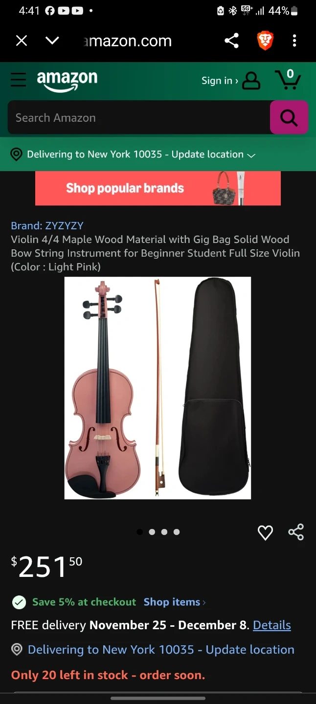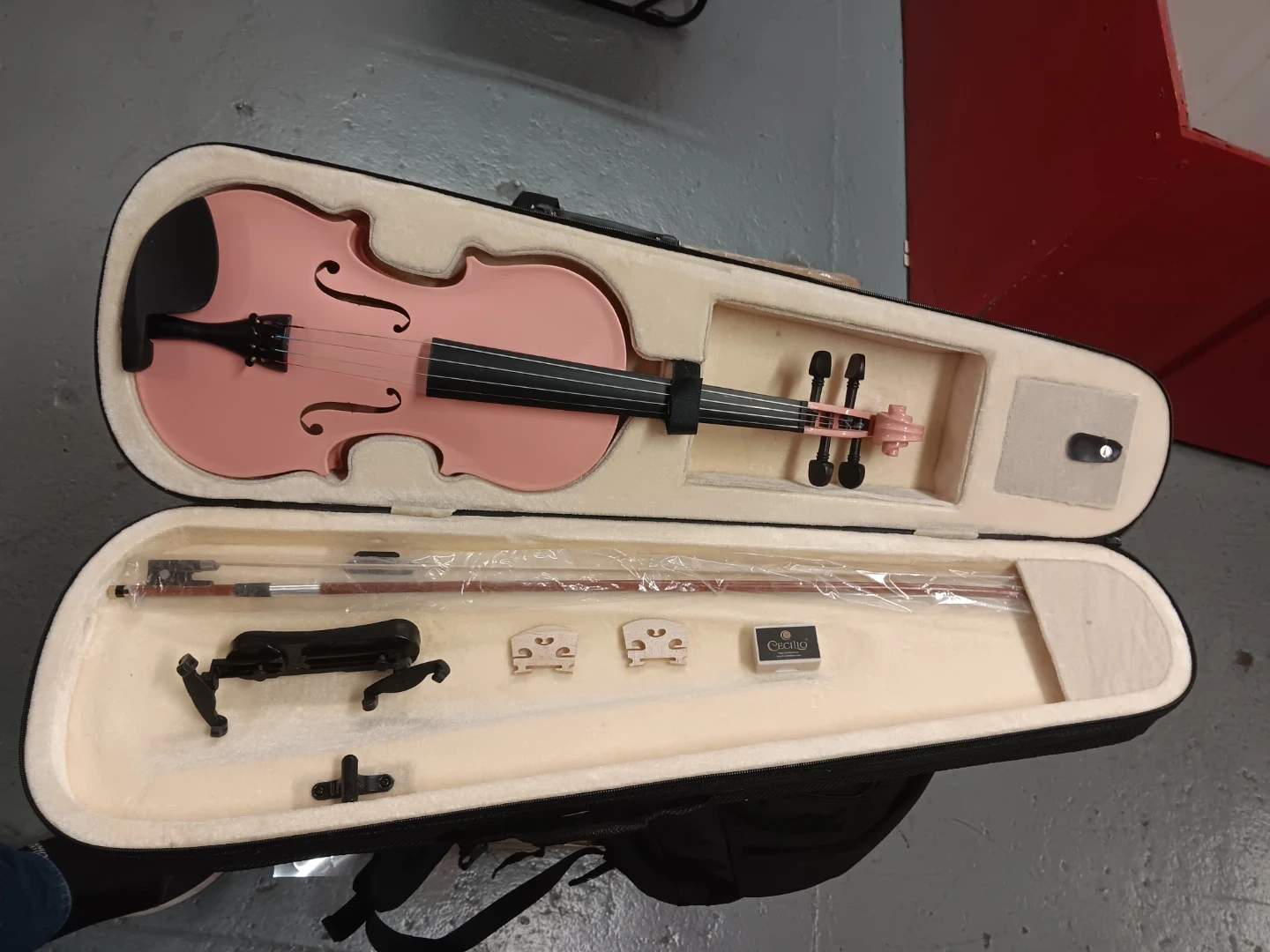 15I have a Mendini 4/4 size violin available. It comes with a case and accessories. The violin is pink and made of maple wood.