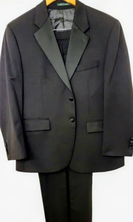 Selling a men's black tuxedo suit. It's in great condition and perfect for any formal event! The suit includes both the jacket and pants.