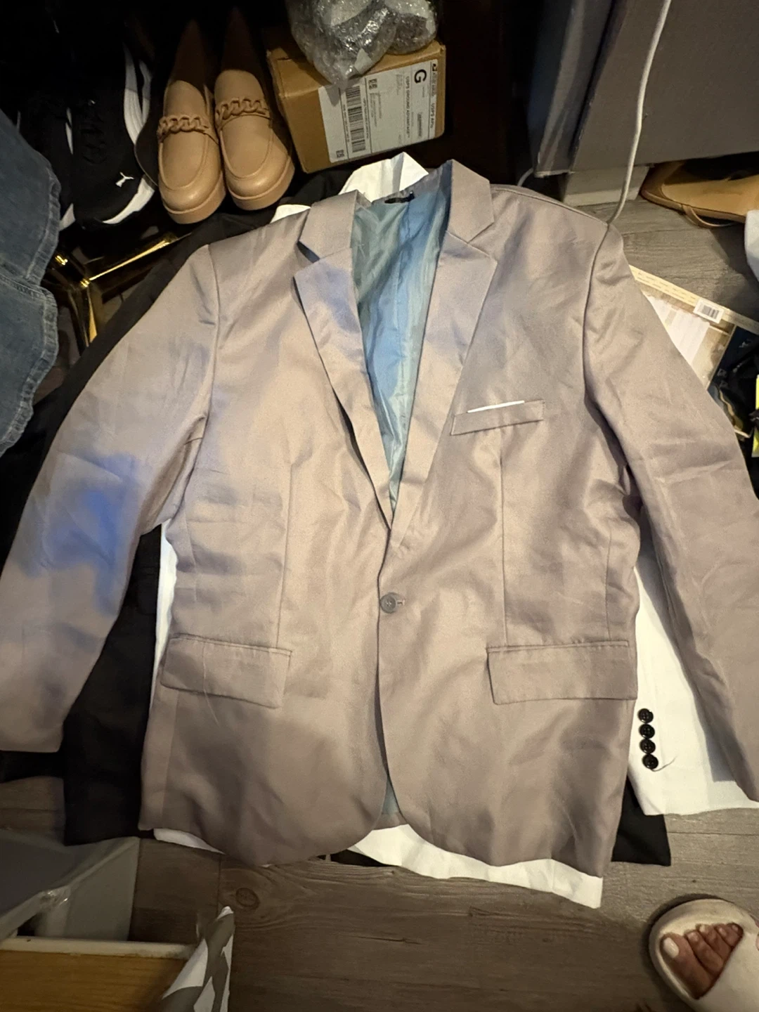 125Selling a men's blazer in a light purple color. It's in good condition and ready for a new owner!