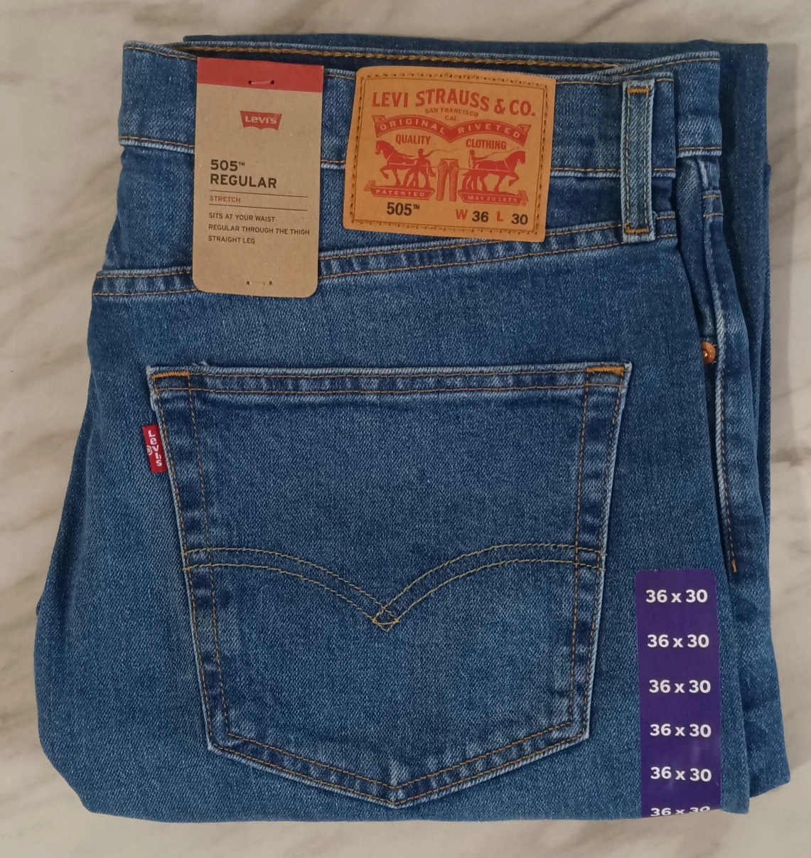 38Men's Levi's 505 Regular Fit Jeans Size 36X30 Brand New $30 Firm. Product Features: 5-Pocket Zipper fly Stretch fabric Fit & Sizing: Regular fit Cut to sit at the waist Extra room in the thigh falls straight to the ankle Fabric & Care Cotton blend Machine wash