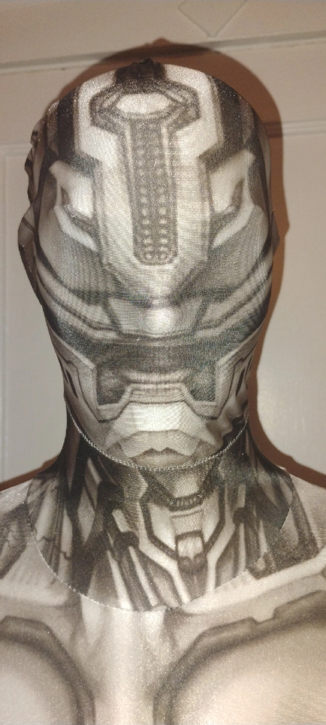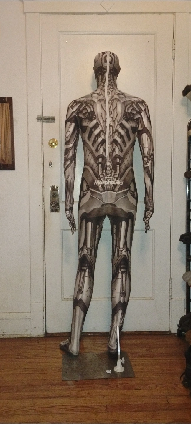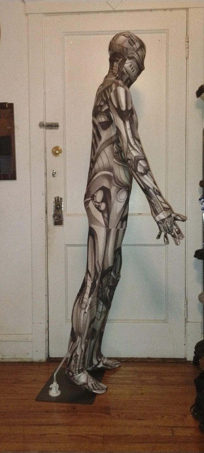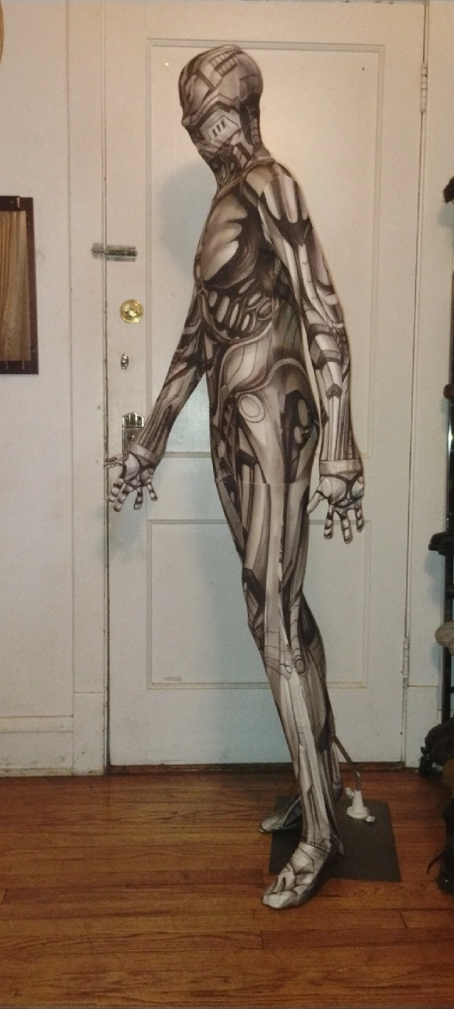 67Selling a robot costume. It's a full body suit with a head covering. The design is a detailed robot or cyborg-like pattern in shades of gray and black. It appears to be made of a stretchy material. Cash only Meet up spot Montrose and Milwaukee Anytime will do except for midnight.