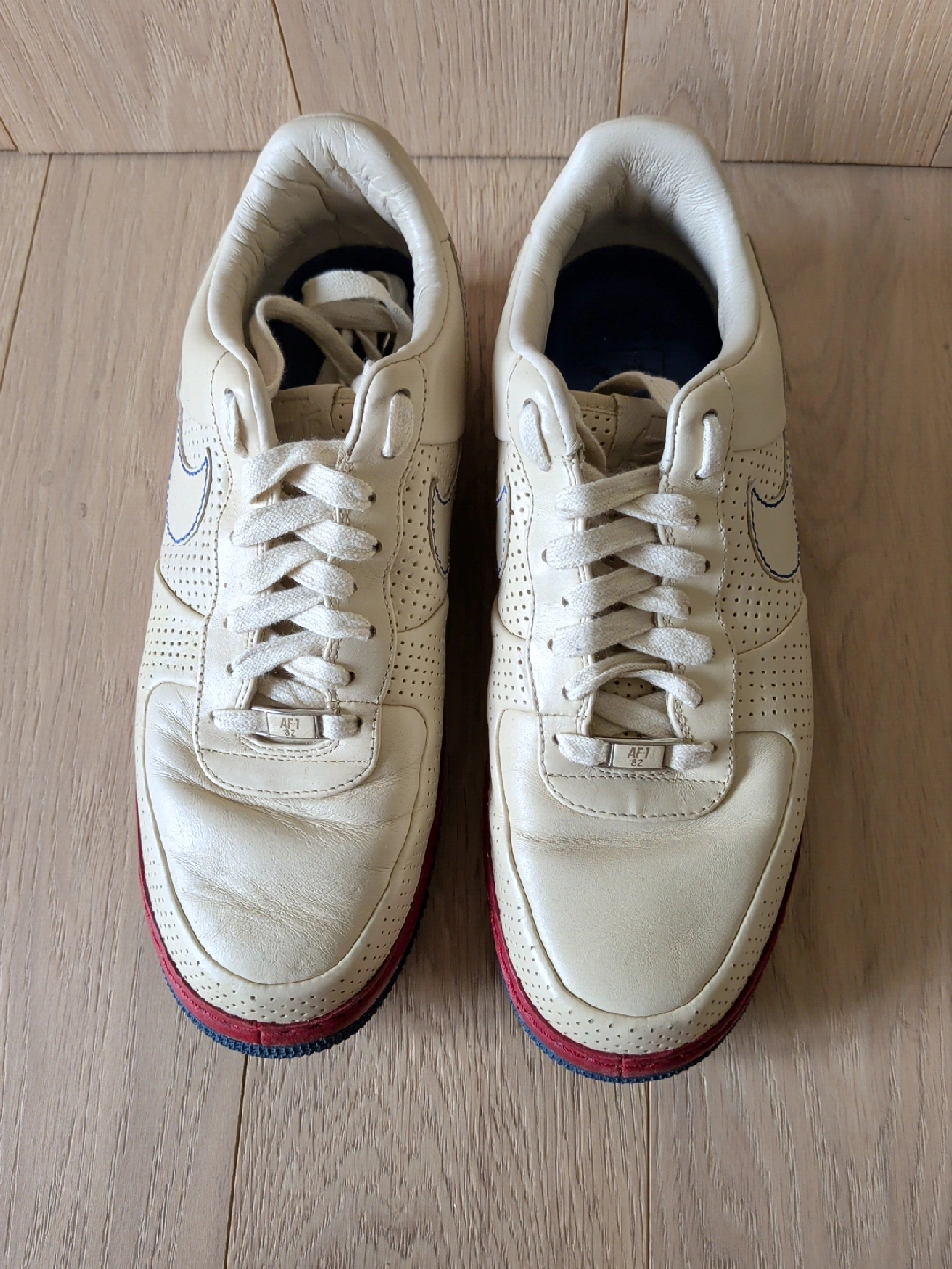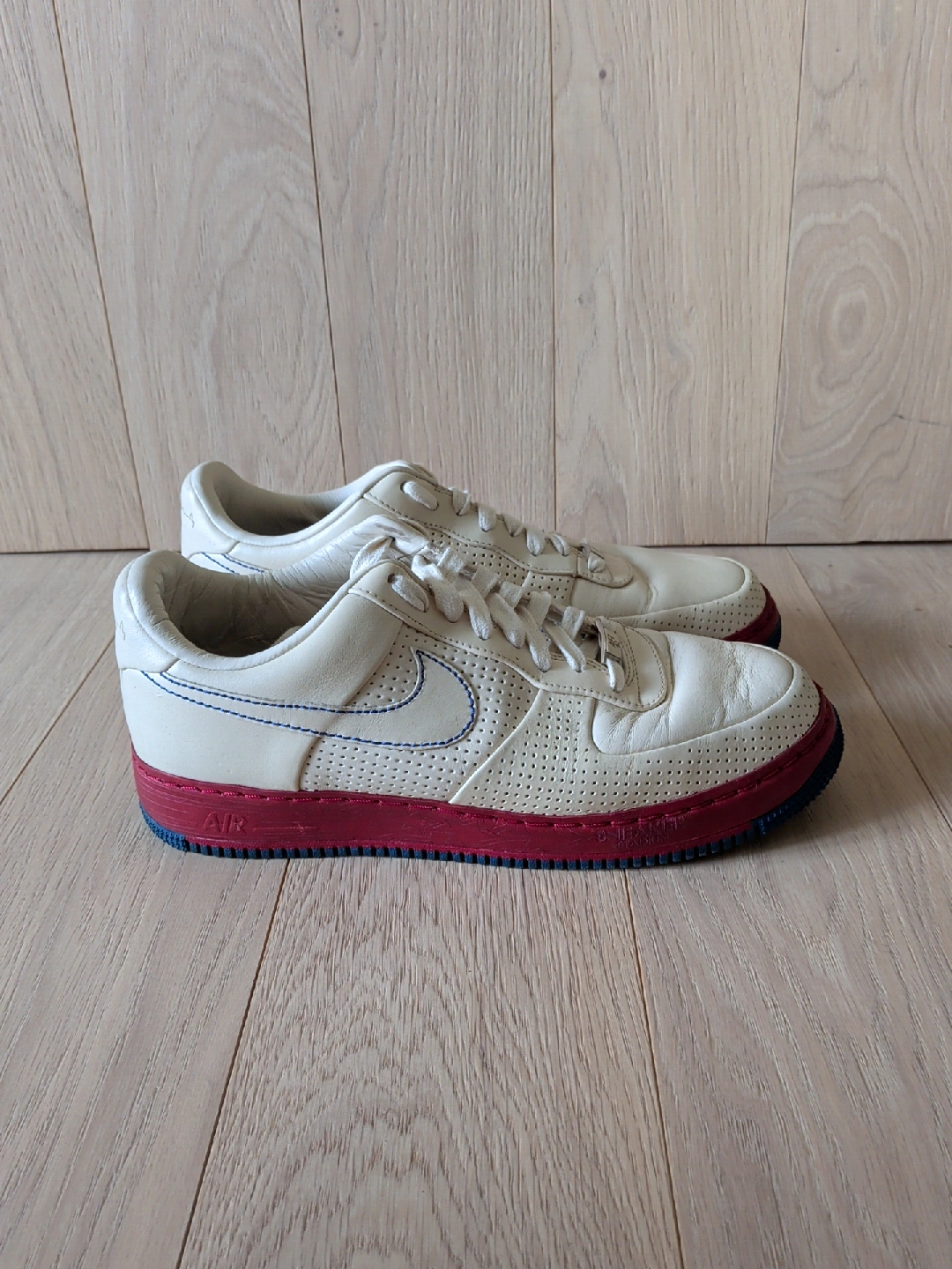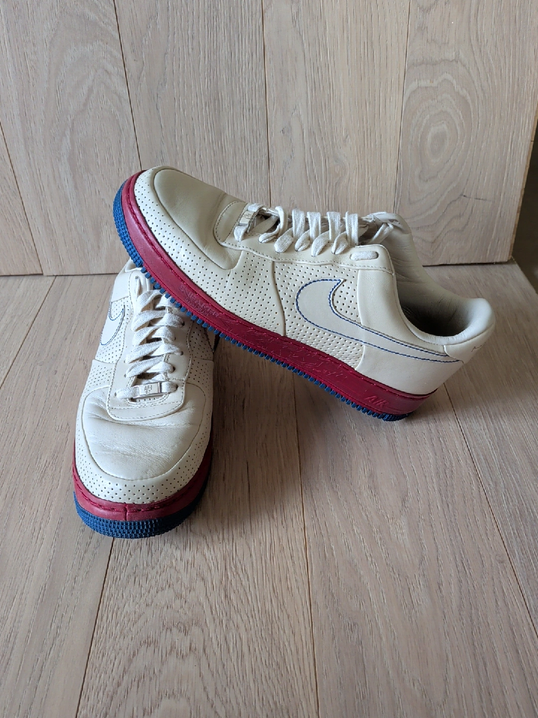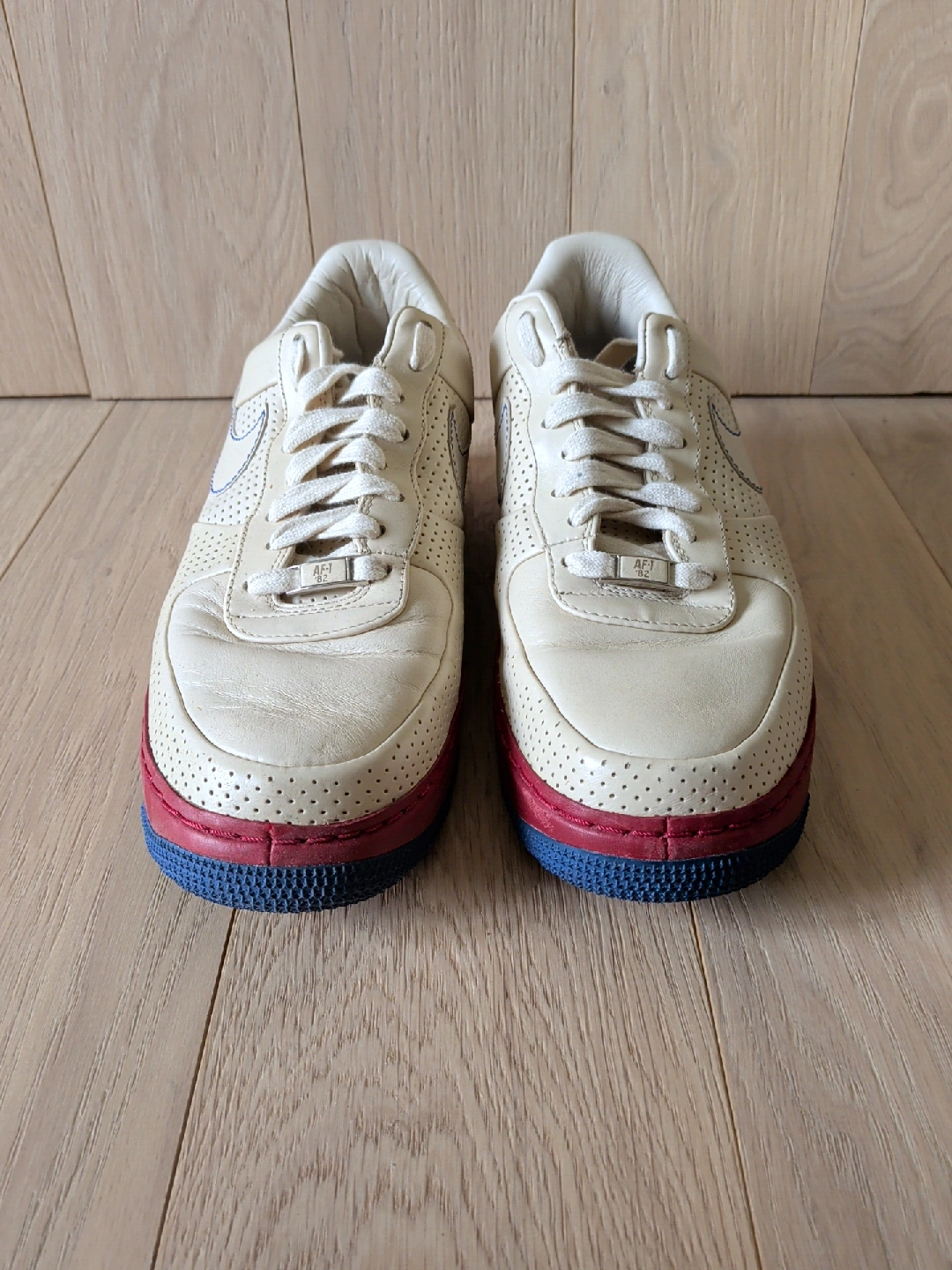 Nike Air Force 1 Low sneakers in a cream color with red and blue accents. These shoes are in used condition, showing some wear. They feature a perforated design and the classic AF1 style. A cool addition to any sneaker collection!