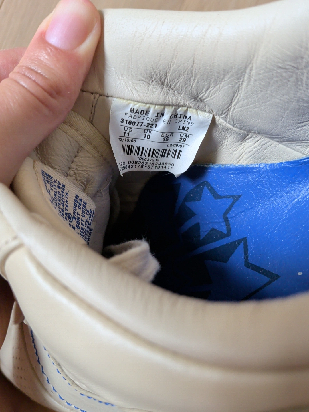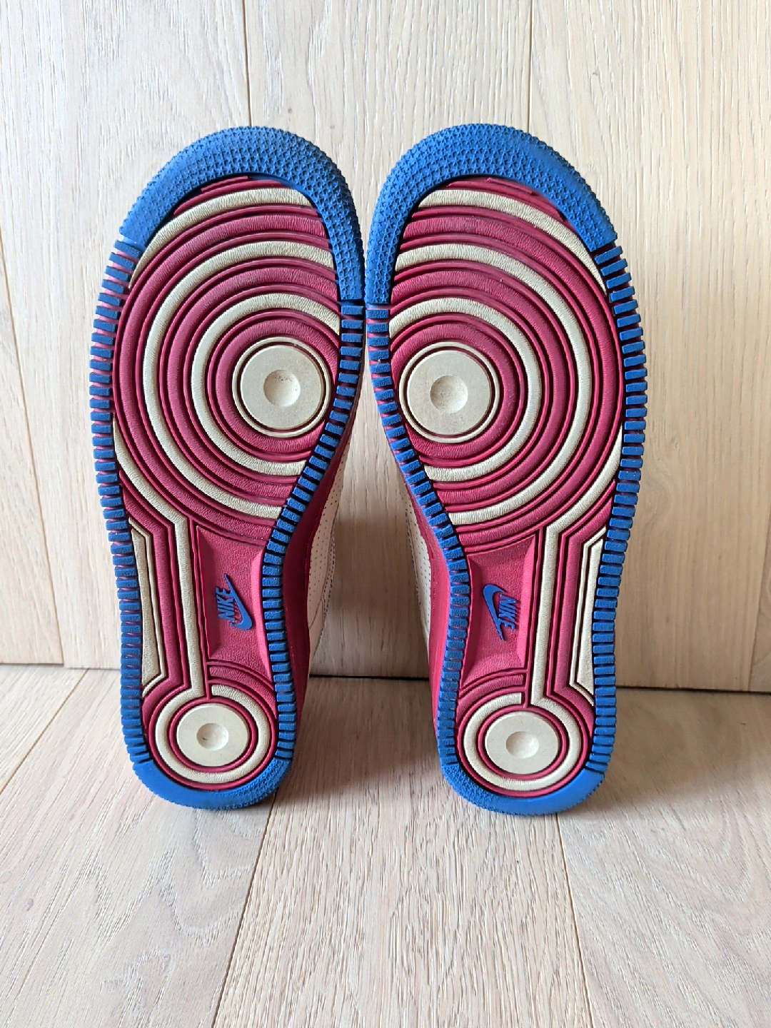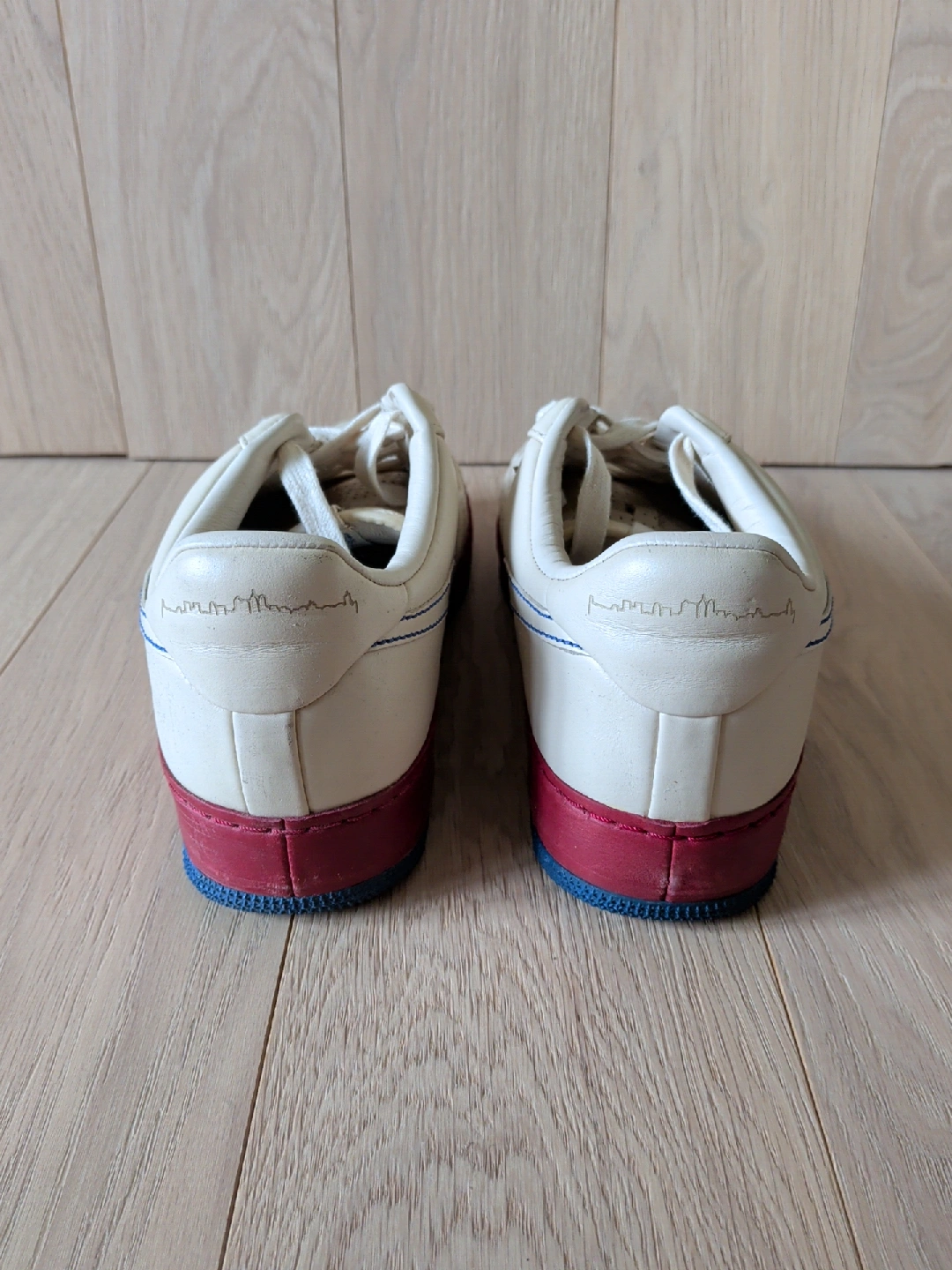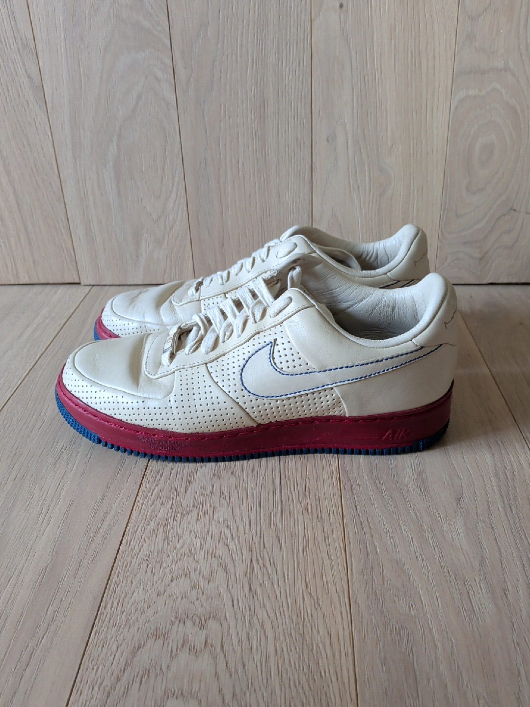 Nike Air Force 1 Low sneakers in a cream color with red and blue accents. These shoes are in used condition, showing some wear. They feature a perforated design and the classic AF1 style. A cool addition to any sneaker collection!