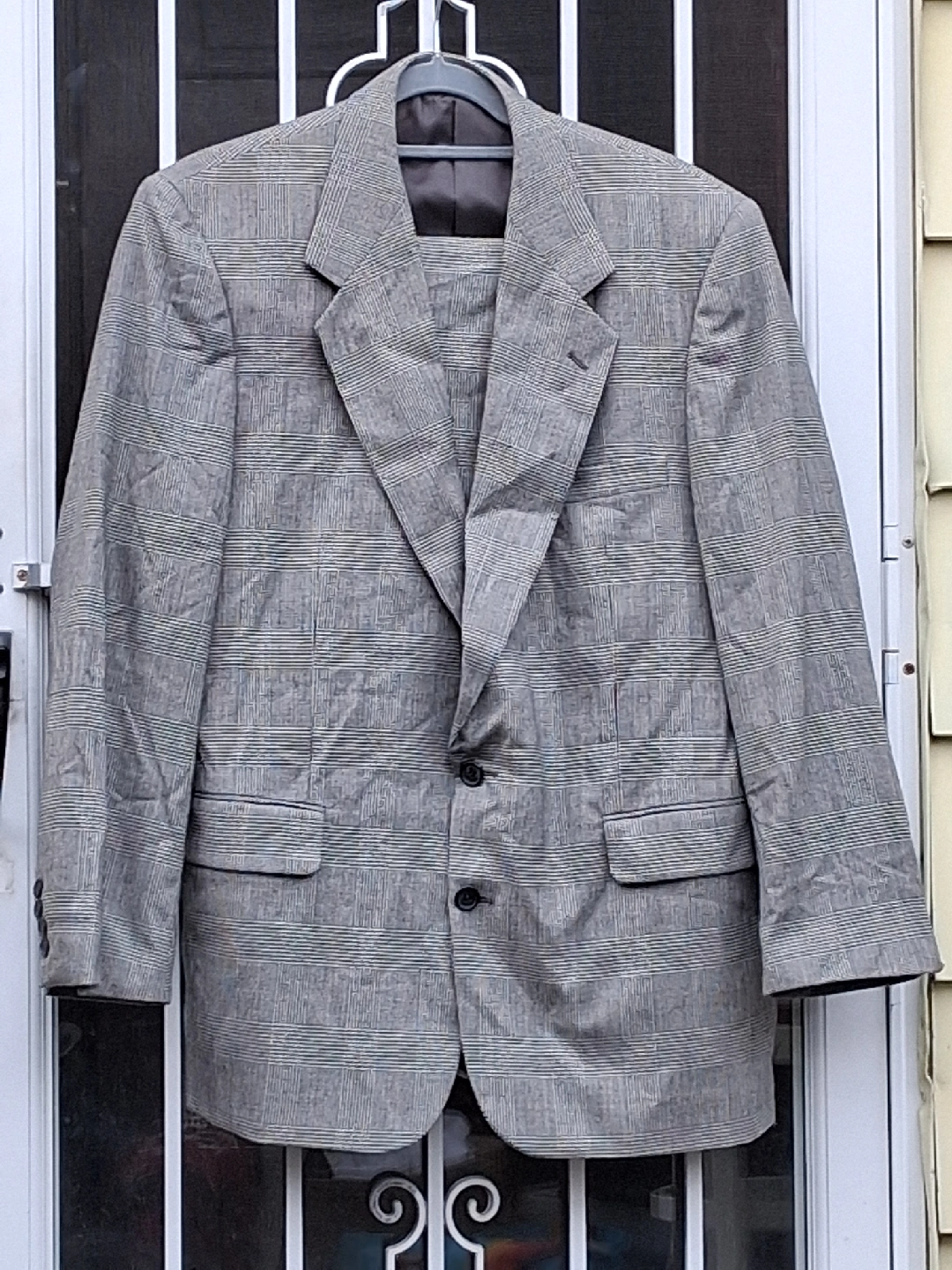 Men's suit in a plaid pattern. It's a two-piece suit with a jacket and pants. Great for business or formal events